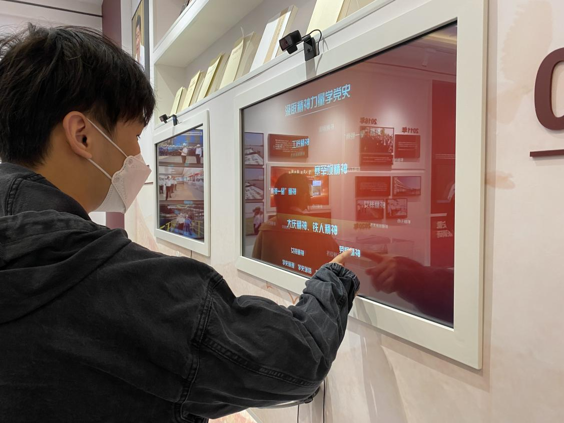 随着“时光之门”的缓缓打开,同学们来到了图片展区,在这里,讲解员深情地讲述了习近平七年知青岁月、习近平在正定、习近平在宁德……一帧帧充满岁月年代感的图片,清晰地记录了习近平总书记艰苦曲折的成长之路,也让大家深切感受了习近平总书记的从容执着和磅礴伟力的气势。在后面的学习“四史”,检索典范故事、致敬先进人物,吟诵红色经典、为红色影视作品配音等板块,更是让同学们深切地感受到了我党百年来的坚韧以及如今幸福生活的来之不易。
