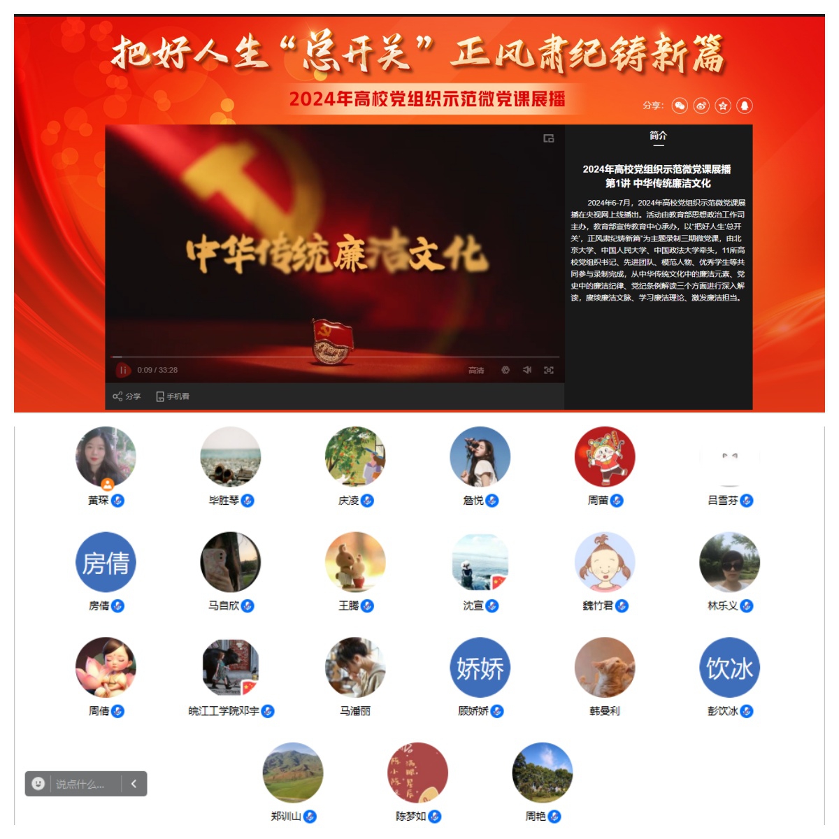 6月21日,18新利怎样基础部党总支组织全体党员通过腾讯会议、微信教育视频等方式观看2024年高校党组织示范微党课展播第一讲《中华传统廉洁文化》的直播,开展微党课视频学习党日活动,集中学习了以“把好人生‘总开关’,正风肃纪铸新篇”为主题的第一期微党课。基础部党总支30余人通过不同方式参加学习。