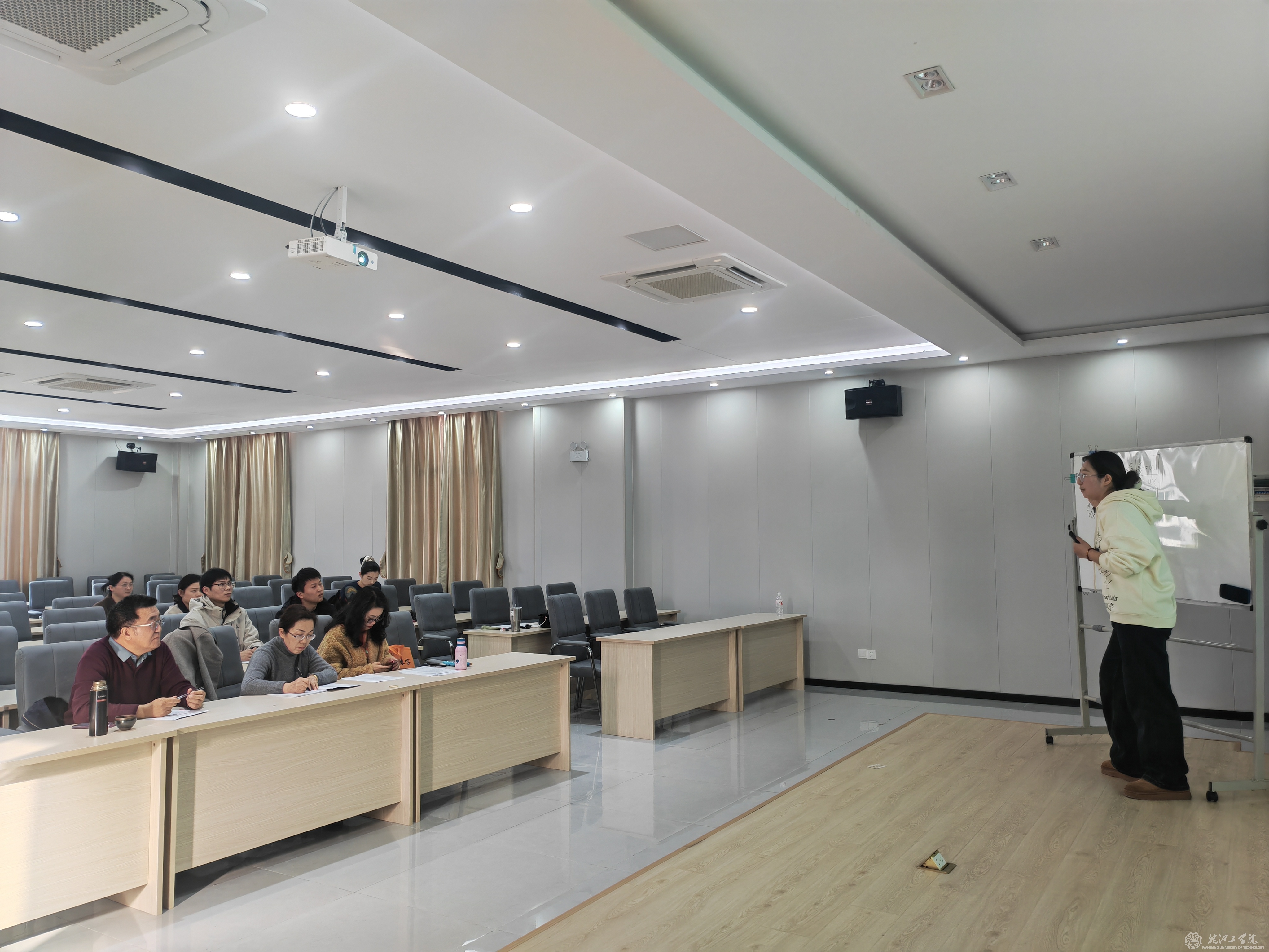 209会议室:数学教研室教师以逻辑推演为核心,通过案例建模展现学科应用价值;英语教研室创新语言教学模式,融入跨文化交际与价值观引导。