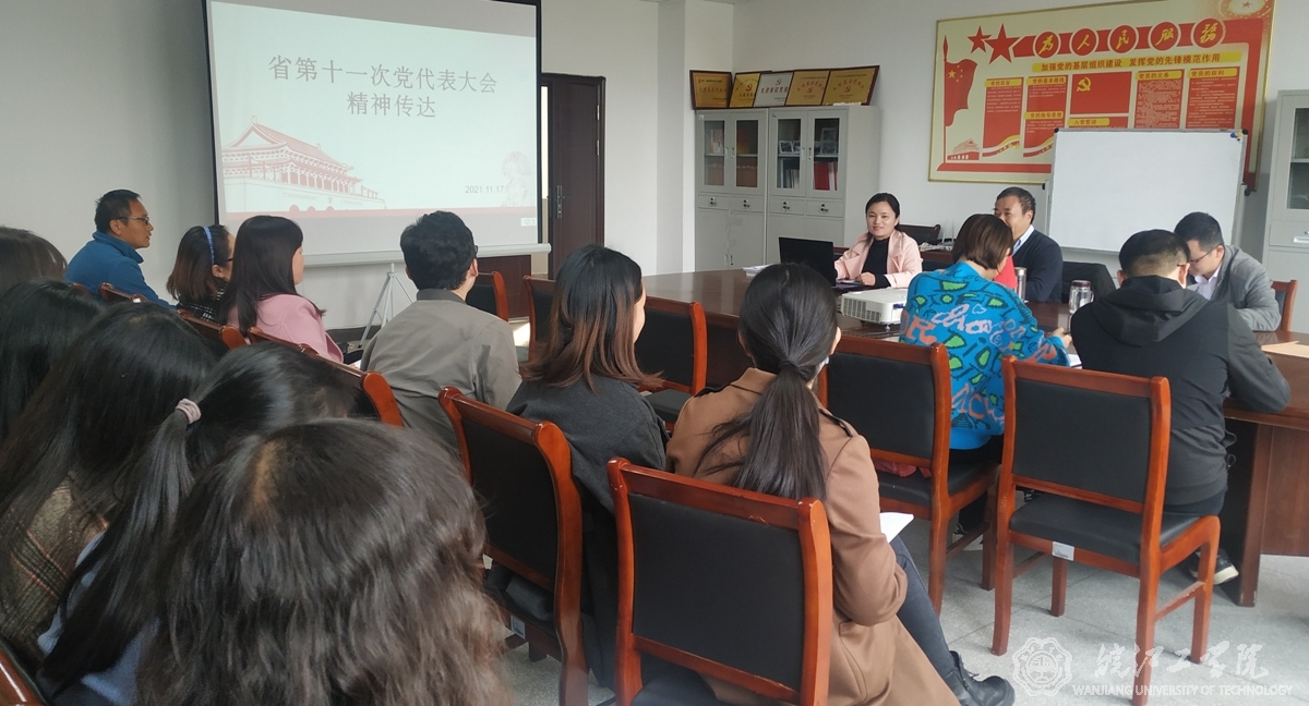 11月17日下午,基础部在E218召开全体教师大会,由我校参加省代会的代表毕胜琴老师传达中国共产党安徽省第十一次代表大会精神。部党总支书记宋洪生、副主任吴云标及全体教师认真聆听了大会精神。