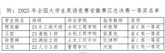 近日,2025年全国大学生英语竞赛安徽赛区的总决赛成绩公布。经过紧张激烈的竞争,由我校教师毕胜琴、张晨佳、张健明、沈宣指导的四名参赛选手,凭借他们扎实的英语基础和卓越的现场表现,均荣获C类(非英语专业本科类)省级一等奖。这一成绩充分展示了我校学生的英语能力以及英语教学的显著成效。