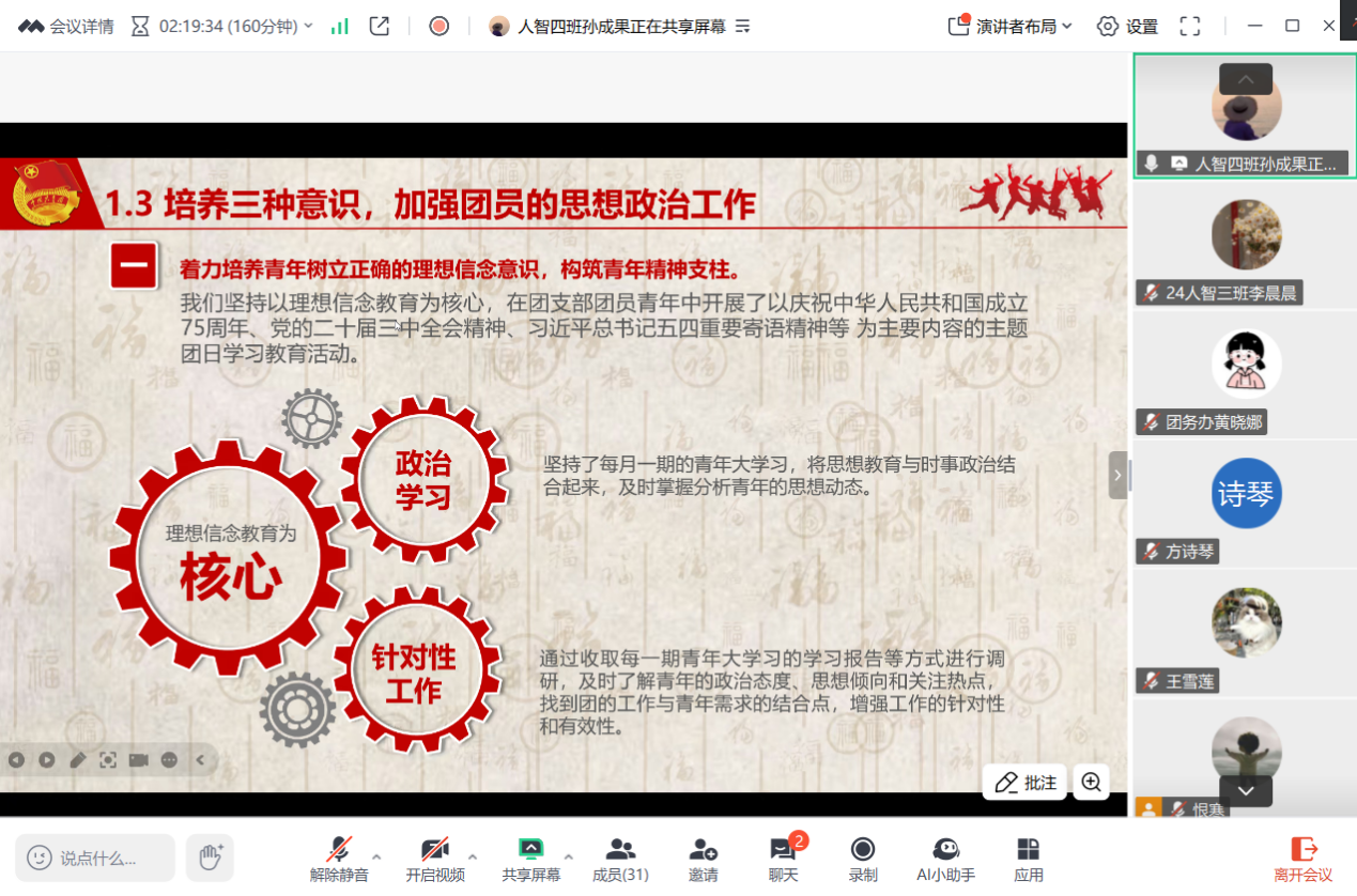 为夯实学院共青团工作的组织基础,切实抓好团干部队伍建设,增强各基层团组织的凝聚力和执行力,提升团支部工作质量,4月13日18时,共青团18新利怎样计算机与人工智能学院委员会组织召开2024-2025学年基层团组织述职汇报线上会议,全体基层团支书参与。