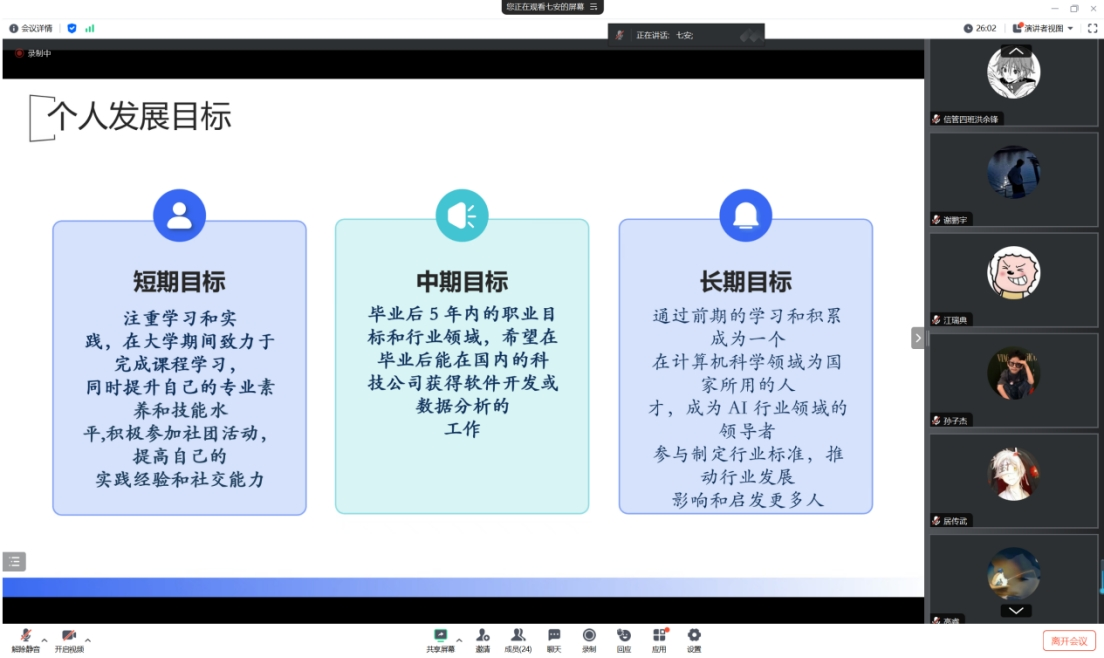 2024年11月26日晚19:00,计算机与人工智能学院开展线上大学生职业生涯规划大赛答辩活动。此次大赛吸引了来自不同年级专业的16位优秀选手积极参与,旨在选拔出院级优秀作品参与校级评选,进一步助力学生明确职业目标,提升职业规划能力。本次活动由学院党总支副书记韦晨珺娃及全体辅导员担任评委,学生会执行主席卞婉情主持。