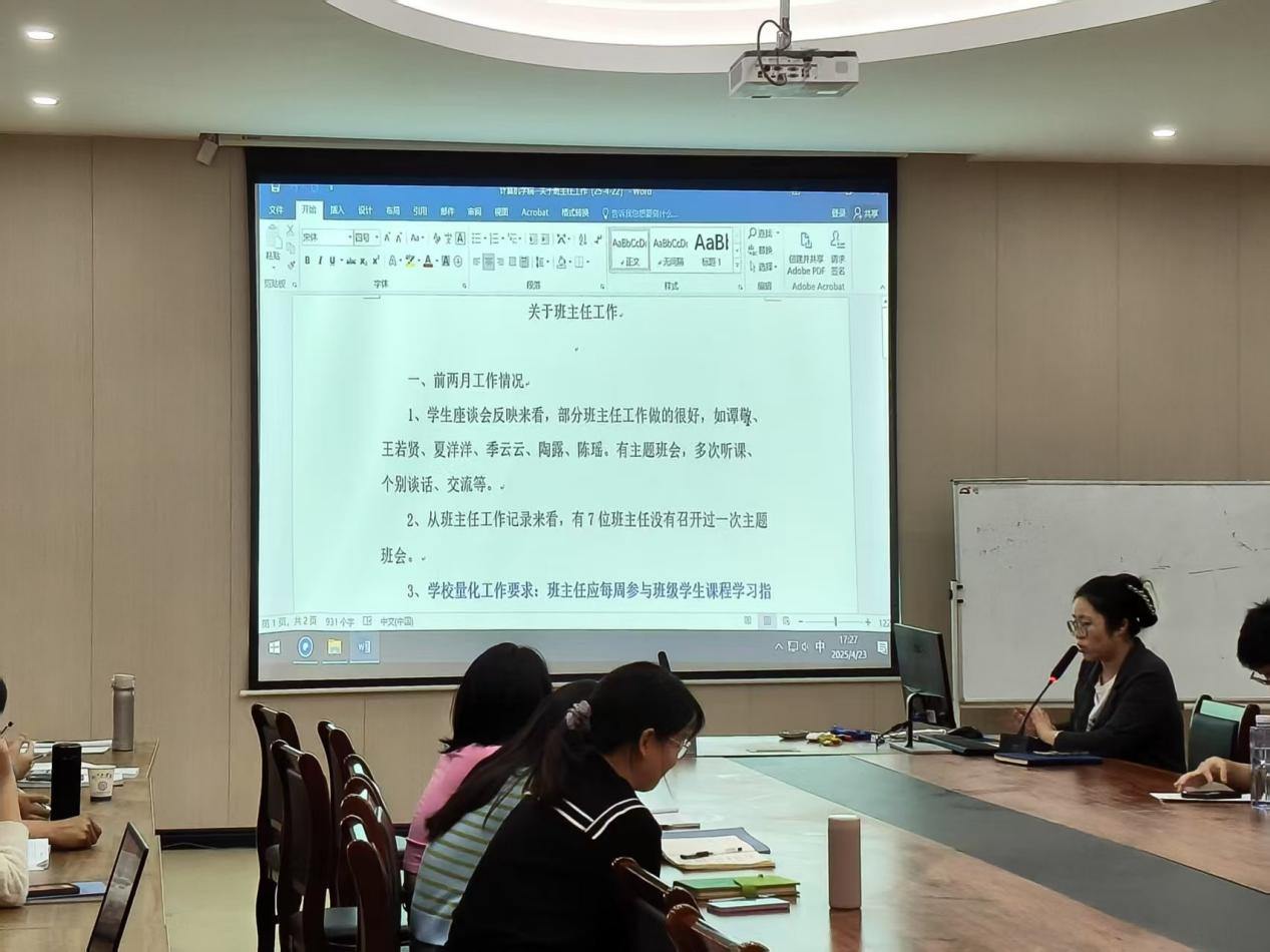 4月23日,计算机与人工智能学院在至善楼5楼会议室召开班主任工作专题会议,通报班主任工作情况以及学生座谈会反映的问题,提出工作要求。学院党总支副书记韦晨珺娃及全体班主任参加了会议。