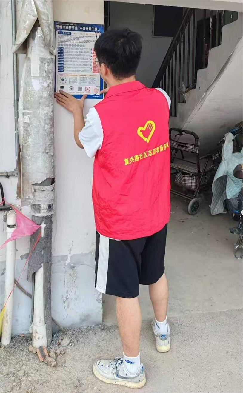 志愿者对社区环境及人员进行调查,发现社区内对于谨防诈骗的宣传力度较弱,经常出现社区人员受到电信以及网络诈骗,因此志愿者决定进行反诈传,张贴反诈海报,希望以此来提高群众反诈骗意识,提高生活幸福指数。
