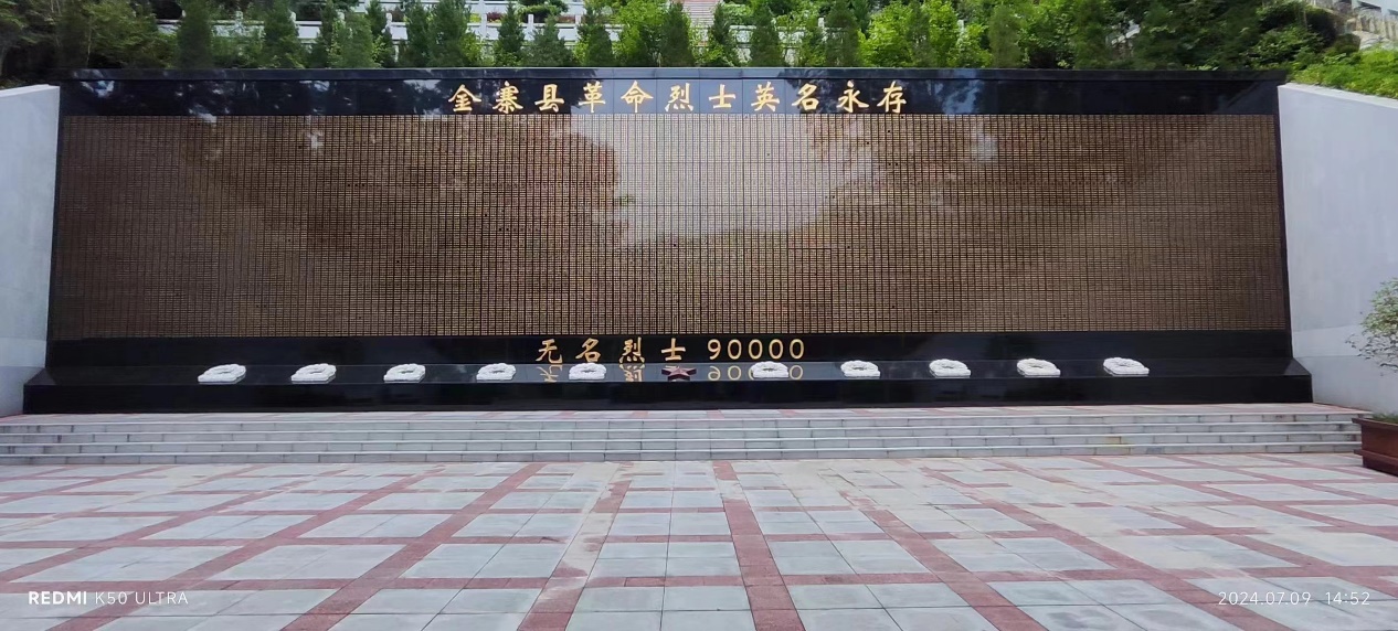步道两旁,花岗岩浮雕栩栩如生,展示着革命先烈们顽强拼搏、英勇无畏的壮丽画面。队员们久久仰望,内心深受震撼。走到台阶尽头,一座高24米的金寨县革命烈士纪念塔赫然矗立。塔正面镌刻着刘伯承元帅题写的“燎原星火”四个大字,背面则铭刻着金寨县革命历史碑文。实践团队成员在塔前敬献花篮,向革命先烈三鞠躬,表达对他们最深的敬意。