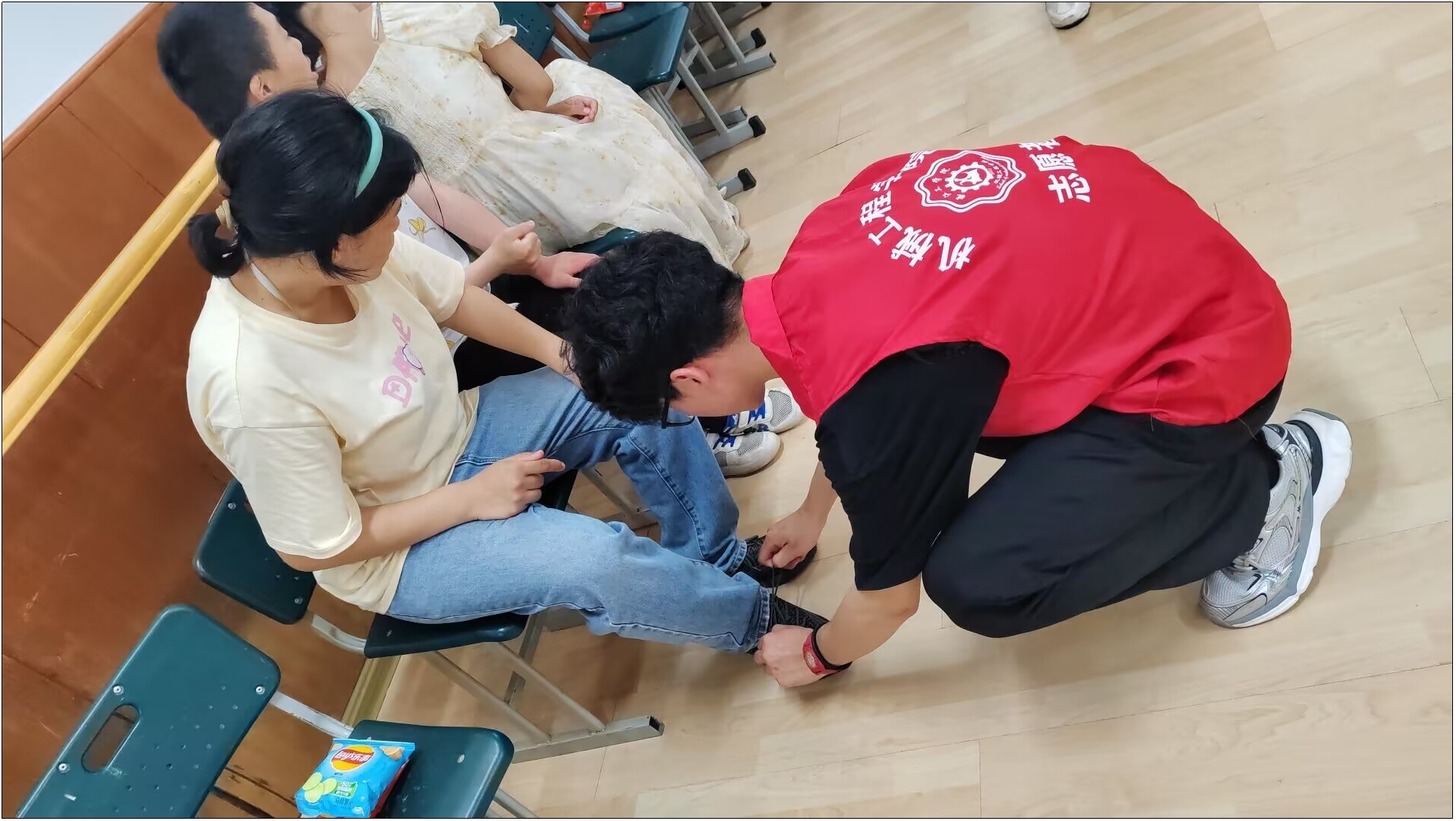 在组织孩童前,在老师的陪护下大家聊天介绍志愿者,去与孩童相熟,便于开展游戏,组长细心地发现了一个女孩鞋带松散,蹲下帮她把鞋带系上,就是因为这样一个无意间的善举,这些孩童感受到了我们三下乡小组的关心与帮助,看似微小的一个举动传递出了温暖和善意,拉进了彼此间距离,从而加深人与人之间的感情。