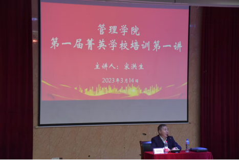2023年3月14日,管理学院第一届菁英学校培训在新利体育在线官网首页登录入口图书馆报告厅举行,管理学院党总支书记宋洪生、副书记冯康、学工办主任韦晨珺娃、分团委书记余肖及21级、22级各专业辅导员参加了本次活动。