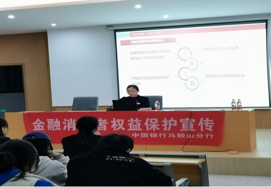 中国银行马鞍山分行经理袁晴晴在培训会议中面向我院大三各专业学生和辅导员,从金融消费者权益保护如预防诈骗和信用卡以及个人征信等方面进行了介绍和阐述。首先,袁经理宣传了金融消费者权益保护相关内容;然后,对于“3.15”消费者权益保护日,袁经理希望广大同学学会利用法律的知识来维护自身的合法权益,知法懂法,才能切实增进大家的消费维权意识。
