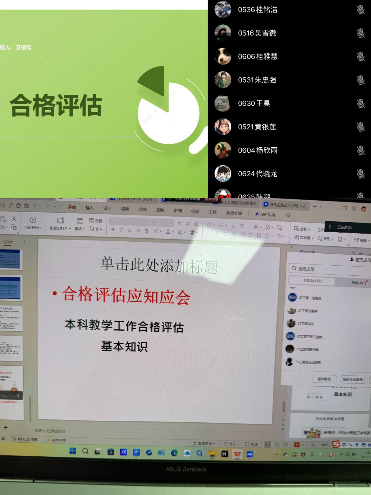 此外,班会还围绕评估指标中与学生相关的内容进行了详细解读,包括学风建设、校园文化活动、学生综合素质提升等方面。辅导员特别强调,学生在评估期间应自觉遵守校纪校规,展现良好的学习风气和精神风貌,积极参与校园活动,注重思想道德修养,以实际行动为学校迎评工作贡献力量。