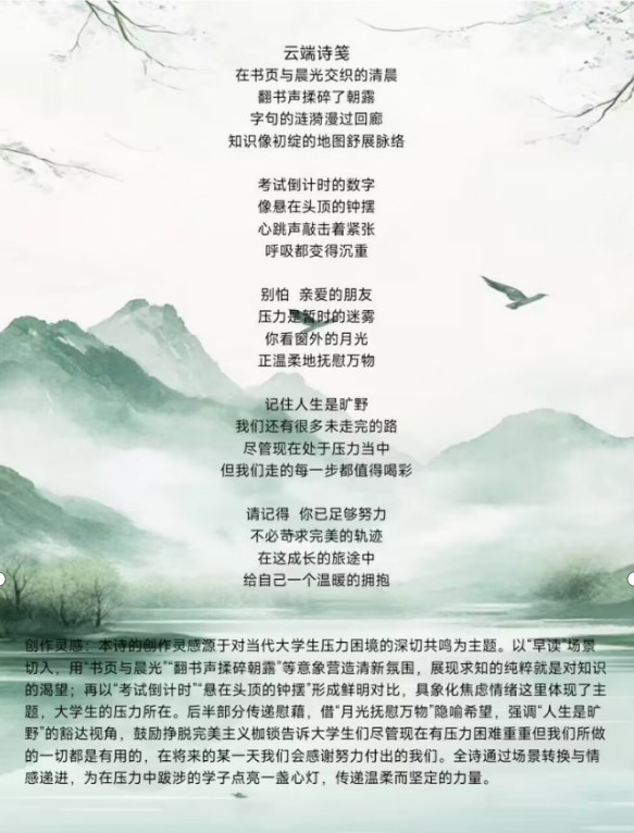 活动面向管理学院23、24级学生,采取线上举行的形式。报名时间为2025年4月20日至4月25日 ,选拔时间从4月27日持续至4月30日。比赛期间,同学们积极响应,踊跃参与,管理学院共征集诗歌作品29份,经学院评审团严格评选,最终6份作品脱颖而出,其中一等奖一名,二等奖两名,三等奖三名。这些获奖作品主题多元、风格各异。有的以细腻笔触勾勒青春成长中的困惑与思索,引发强烈情感共鸣;有的以激昂文字抒发对理想信念的矢志追求,彰显蓬勃向上的精神风貌;还有的将中华优秀传统文化元素巧妙融入诗歌创作,字里行间尽显深厚的文化积淀。作品充分展现出同学们扎实的文学素养,更折射出他们对生活的深刻洞察,以及积极乐观的人生态度。