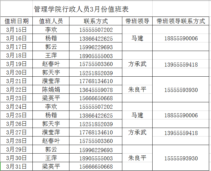 为切实做好当前严峻疫情形势下防控工作,并贯彻落实学校疫情防控专题工作会议精神,管理学院从2022年3月15日开始实行辅导员、行政人员值班制度,具体值班表安排如下: 所有值班人员需要做到:
