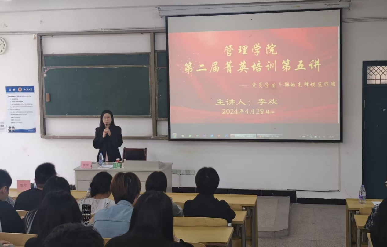 4月29日,由管理学院党政办主任李欢老师主讲,主题为党员学生干部先锋模范作用。李欢老师从大学生的申请入党条件、发展党员的基本条件、入党积极分子的确定、教育和考察以及大学生入党流程及注意事项这四个方面展开述说了大学生应如何进行党员发展。老师要求党员学生干部应作好表率工作,为想入党的同学树立好学习的榜样。李欢老师强调了党员学生干部在学院发展和学生工作中的重要性,以及如何通过自身的先锋模范作用,引领同学们共同进步。