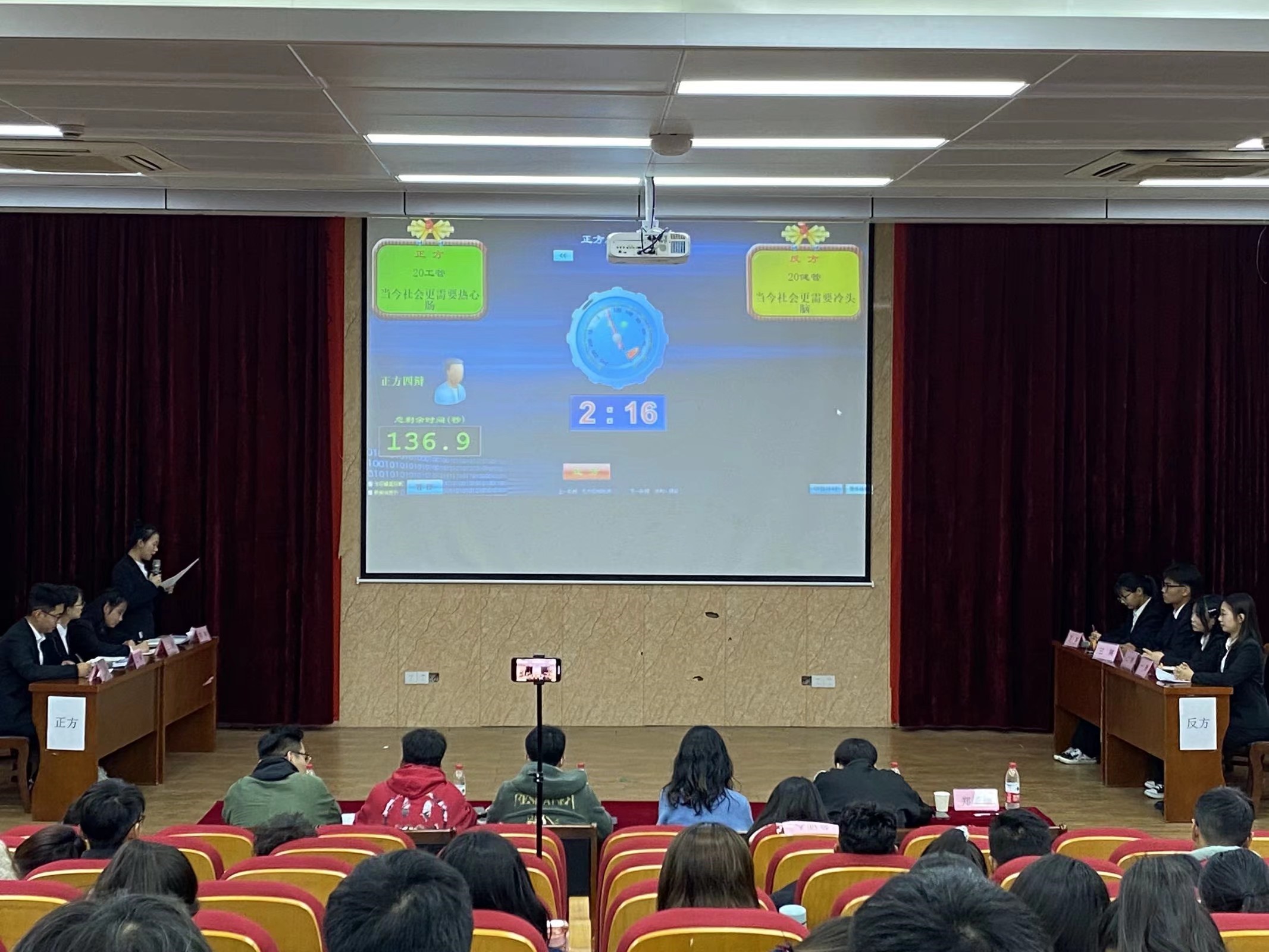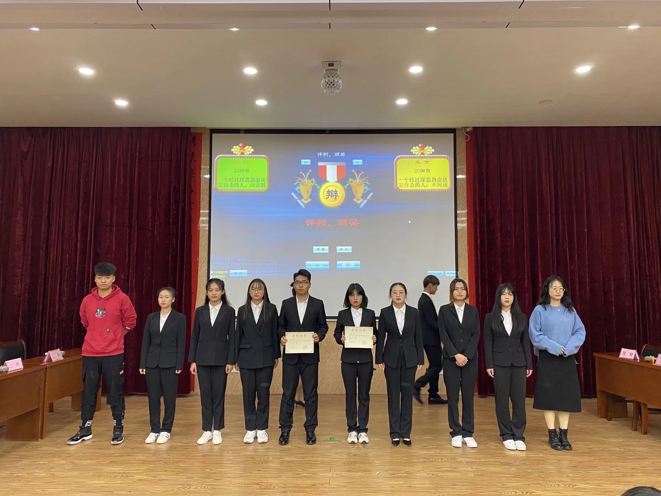 主持人介绍完各位评委以及公正人,比赛正式开始。选手们针对自己的观点,开始了激烈的辩论赛。选手们随机应变,抓住对方辩手的逻辑漏洞,进行了激烈的唇枪舌战。随后自由辩证环节,双方辩手旁征博引,针锋相对,将比赛推向了高潮。其中管理学院一等奖团队为20工管和19酒管,二等奖团队为20健管和19工管,最佳辩手分别是20健管的童慧茹和19酒管的王佳佳。