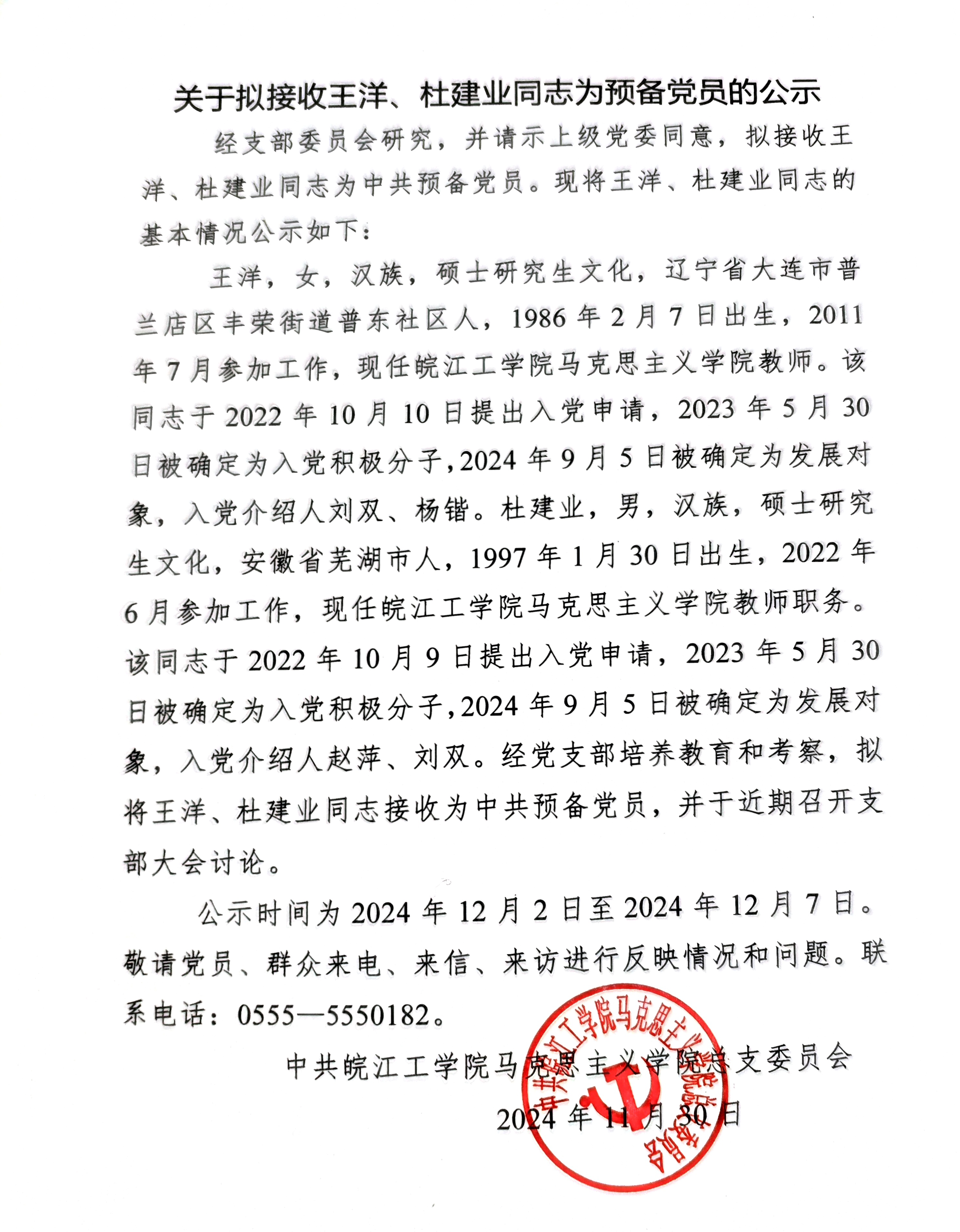 关于拟接收王洋、杜建业同志为预备党员的公示