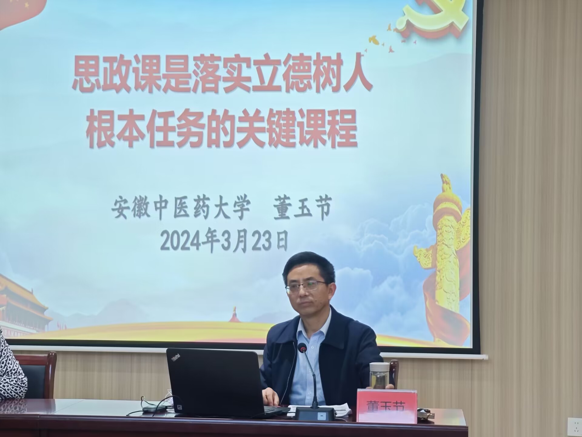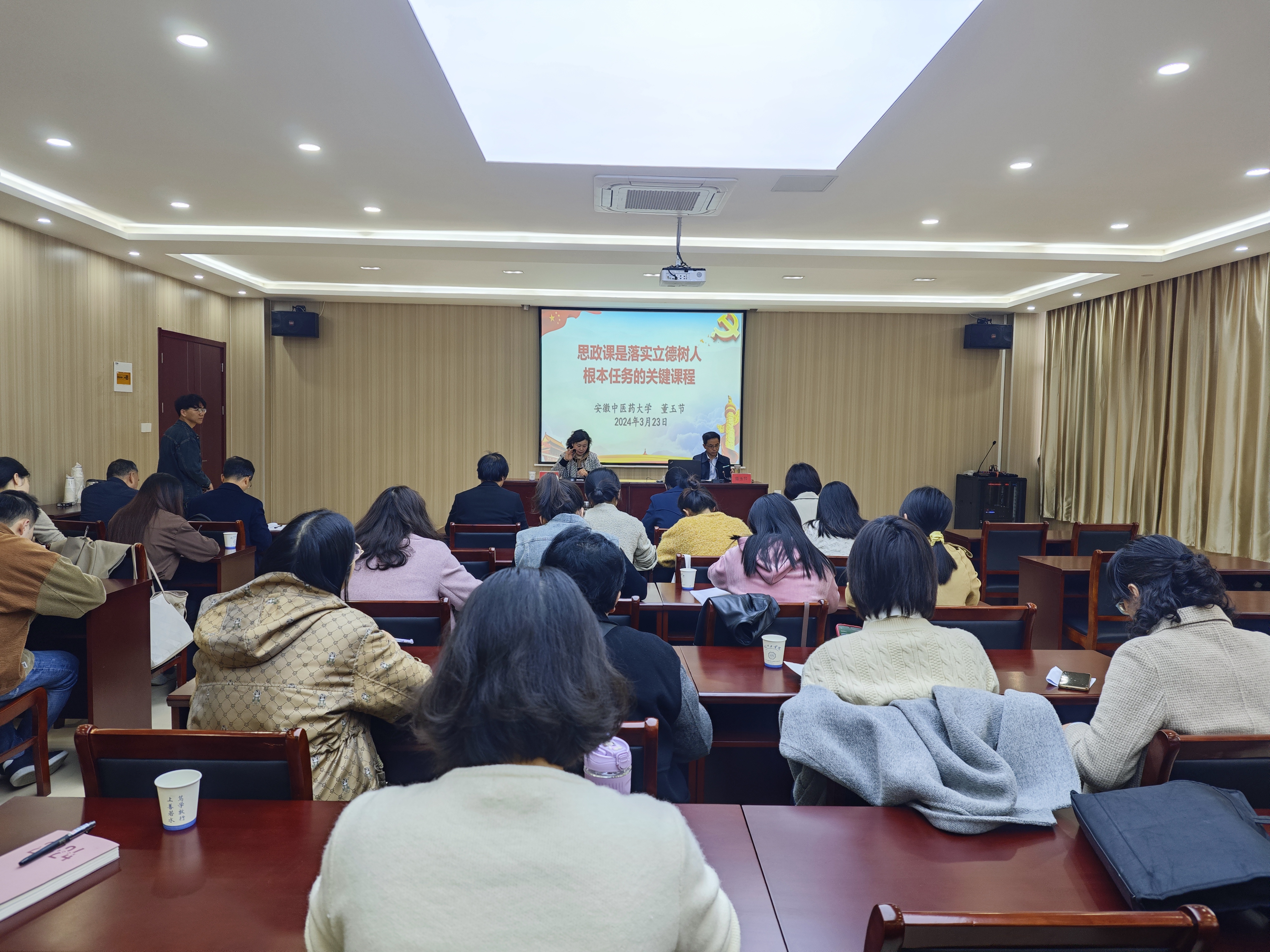 3月23日,安徽省高校思政课教指委委员、办公室主任、安徽中医药大学马克思主义学院院长董玉节教授,应邀莅临我校马克思主义学院开展题为“思政课是落实立德树人根本任务的关键课程”专题讲座,马克思主义学院党总支书记、常务副院长刘双,院长助理张春艳,各教研室主任及马院全体教师参加培训。讲座由刘双主持。