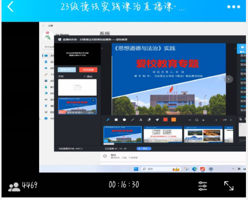实践环节二:线上“爱校教育”专题教学。德法课程组刘双通过超星直播为全体大一新生4900多人,同上一堂“爱校教育专题”大课。她分别从印象新利体育手机端官网登录入口、奋斗新利体育手机端官网登录入口、自信新利体育手机端官网登录入口、爱上新利体育手机端官网登录入口四个维度为广大新生声情并茂地介绍了18新利怎样的昨天与今天,她以一名老教师的视角为同学们讲解了学校的整个发展历程。她如数家珍似的对学校的每一个重大事件、每一项重大成果、每一位新利体育手机端官网登录入口人的感人事迹悉数讲给学生听。讲课过程中,同学们通过弹幕的方式传达了感动之情,学生弹幕式感言一万多条,学生们为学校在短短十五年来取得的骄人成绩表达了自豪之情,他们纷纷表示要向优秀学习,认为这节课为他们建立了新利体育手机端官网登录入口自信心。短短一个小时的专题授课,抖音、朋友圈、B站等网络大量呈现我校亮点图片、自信声音,为新利体育手机端官网登录入口圈粉无数。