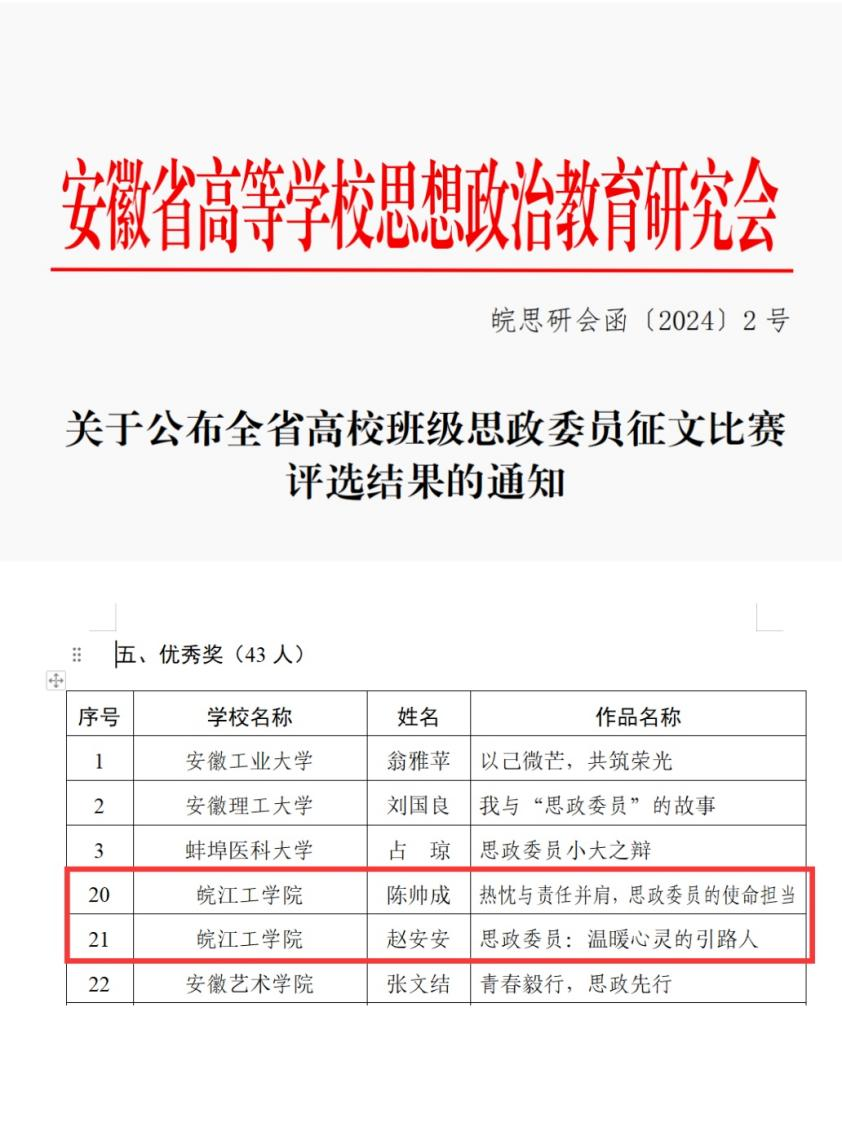 近日,由安徽省高等学校思想政治教育研究会举办的全省高校班级思政委员征文比赛评选结果公布。我院教师吴慧慧指导的马克思主义学院“大思政课”实践教学讲解员陈帅成同学《热忱与责任并肩,思政委员的使命担当》和赵安安同学《思政委员:温暖心灵的引路人》荣获优秀奖。