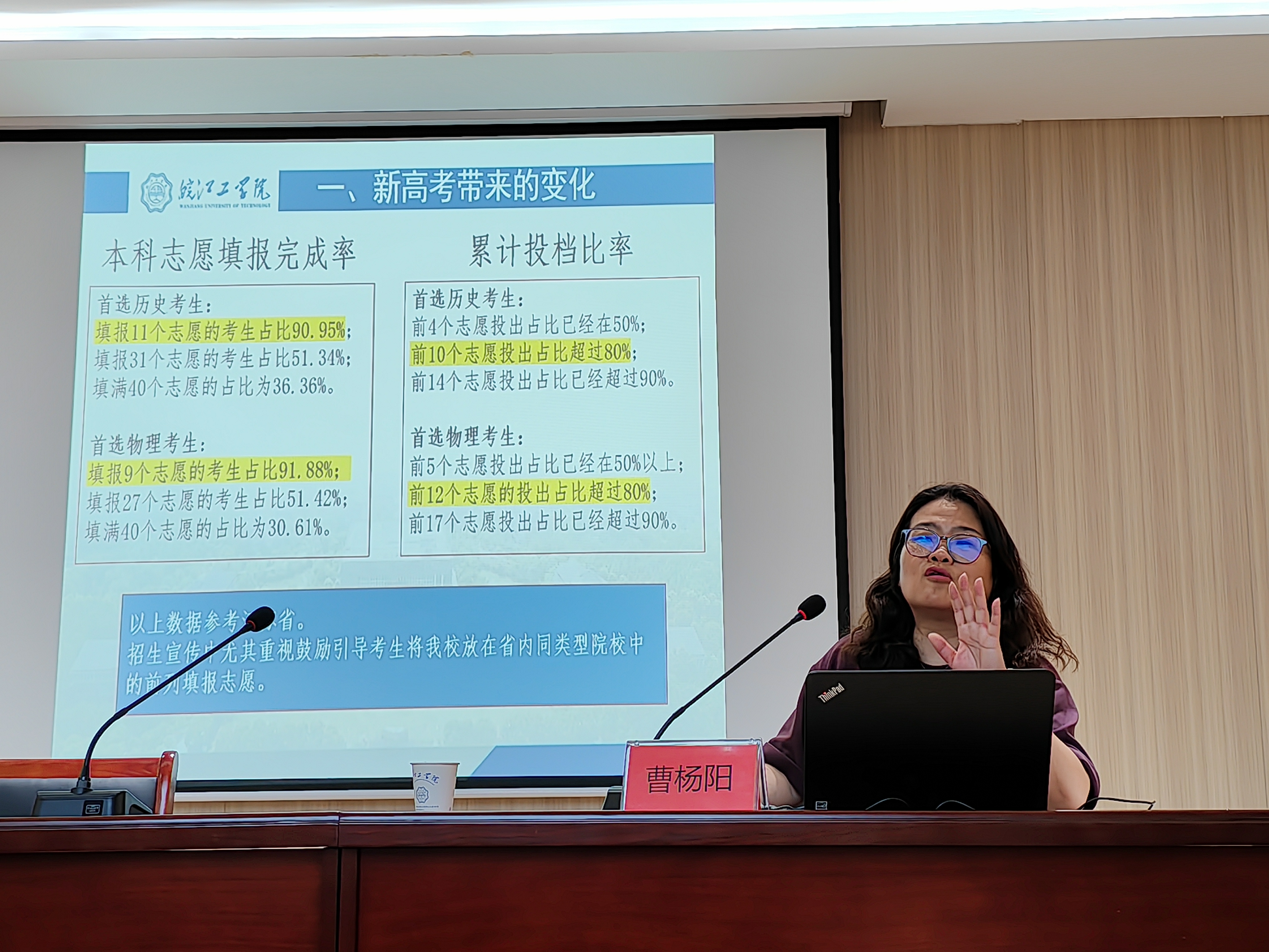 曹杨阳首先明确招生工作对于民办学校的重要性和迫切性,就学校定位、专业设置、新高考变化、填报志愿等方面展开讲解。他强调,马克思主义学院针对所负责的片区要做好提前规划,老师们应当加强对发展规划、办学特色、专业设置的认知,掌握宣传技巧和填报策略。同时,他提到几点建议:第一,与负责片区提前联络部署,维持关系;第二,做好复盘工作,整理所在片区学生名单;第三,招生宣传要突出亮点特色。为更好地宣传推广学校,吸引更多优质生源做积极的贡献。