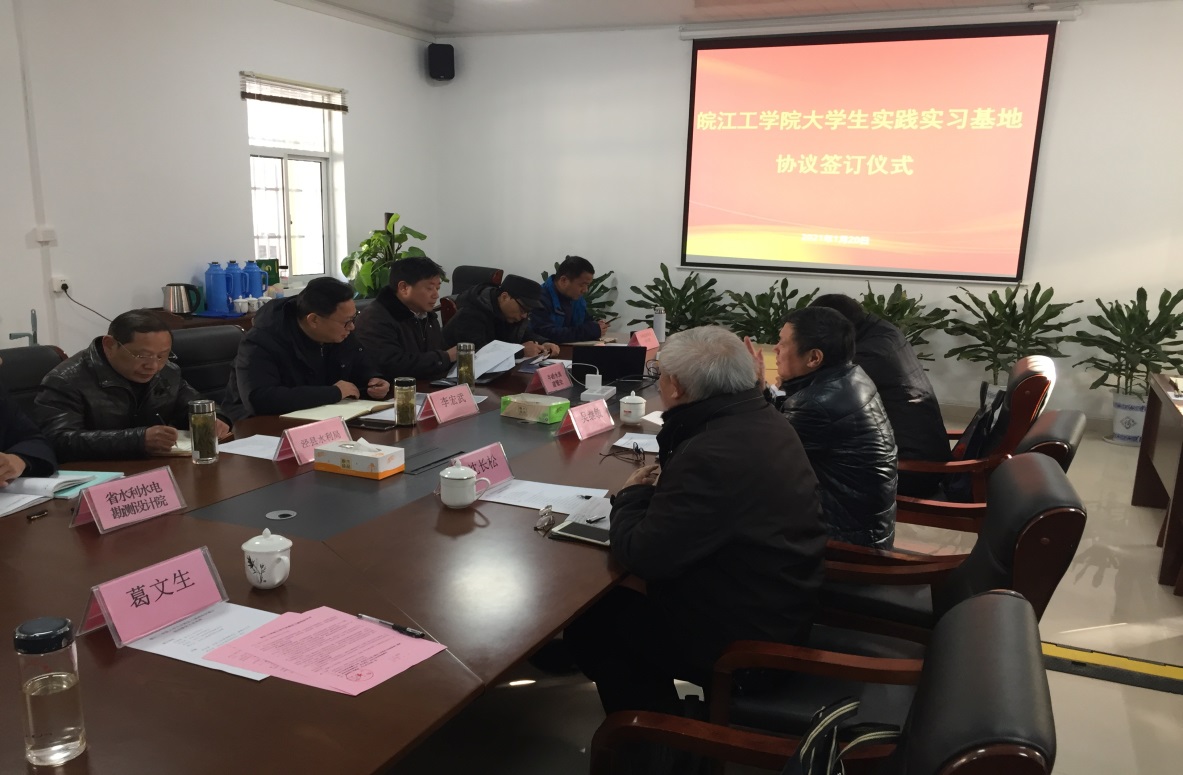 1月20日上午9:00,签订仪式正式开始,泾县人民政府副县长兼建管处主任李宏斌首先对吴校长一行的到来表示欢迎,并介绍了牛岭水库的基本情况和建设进展以及目前存在的问题和未来建设规划;吴继敏校长详细介绍了我校的基本情况、办学历程、专业和学科建设以及专业特色等;沈长松院长就水利院的情况、人才培养、实习基地建设等方面进行交流,他强调了实习基地建设对学生的重要性,把理论知识和工程实践结合起来,培养地方性应用型高级技术人才。双方还就资源共享、优势互补、实习工作安排、科学研究与创新、技术咨询等方面展开交流并达成共识。