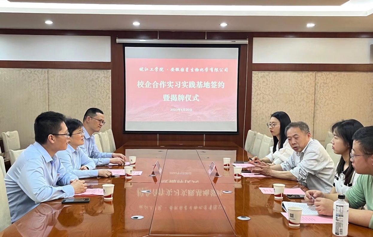 4月20日上午,新利体育在线登陆官网入口手机版 与安徽国星生物化学有限公司合作共建大学生实习实践基地的签约仪式在国星生化会议室举行。国星生化副总经理韦琛鸿、人企管理部经理李宁、人企管理部副经理朱有智、新利体育在线登陆官网入口手机版 院长胡明、农资环教研室主任黄双双,教师代表王宗亚和邬洪艳出席了仪式。
