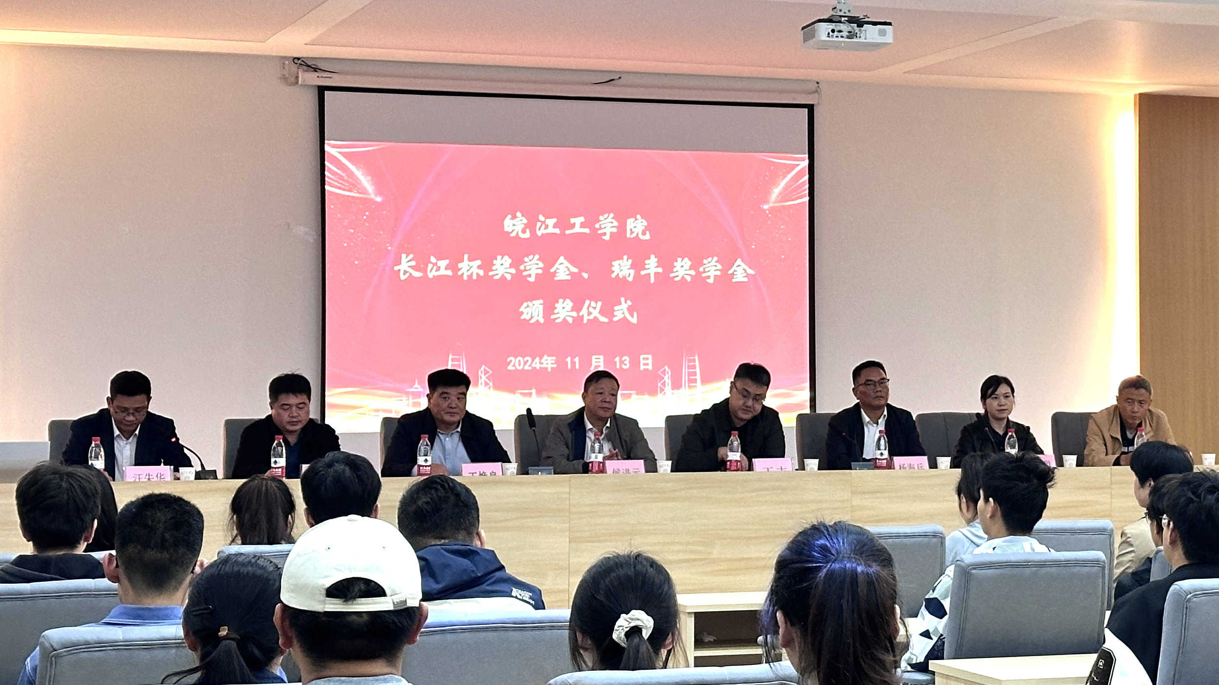 11月13日下午15:30,我校在水木楼楼西301会议室隆重举行了2024-2025学年“长江杯奖学金”和“瑞丰奖学金”颁奖典礼。安徽省长江河道工程有限责任公司董事长杨海兵、人力资源部部长宋小甜和安徽瑞丰工程科技集团有限公司董事长王焕良、副总经理吴玉凯、财务总监孙鲜明,我校副校长侯进元、副校长王志,水利工程学院党总支书记李冠华,学工部常务副部长汪朱华出席此次仪式。颁奖仪式由汪朱华主持。“长江杯奖学金”和“瑞丰奖学金”分别由两家企业出资设立。
