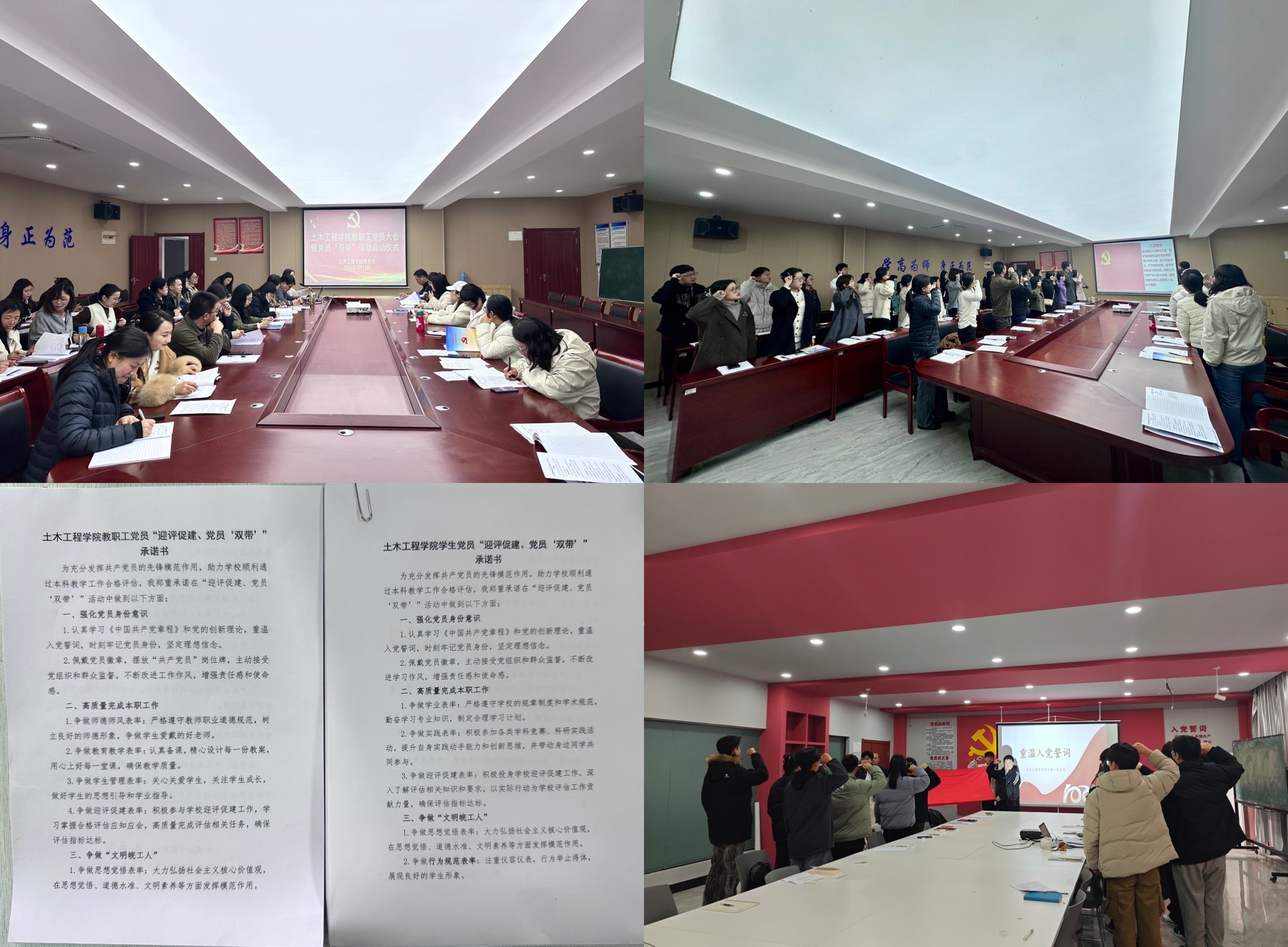 学院党总支以一次动员大会、一份庄严承诺、一次重温誓词、一枚闪亮党徽、一个示范岗位“五个一”工程为抓手,全面强化党员意识。全体师生党员100%签订“迎评促建、党员‘双带’”承诺书,明确在师德师风、课程建设、材料整改等环节的责任清单,设立45个“党员示范岗”主动接受师生监督,成为教学科研一线的红色标杆。各支部还通过“三会一课”和主题党日活动,持续深化党的创新理论学习,筑牢思想根基。