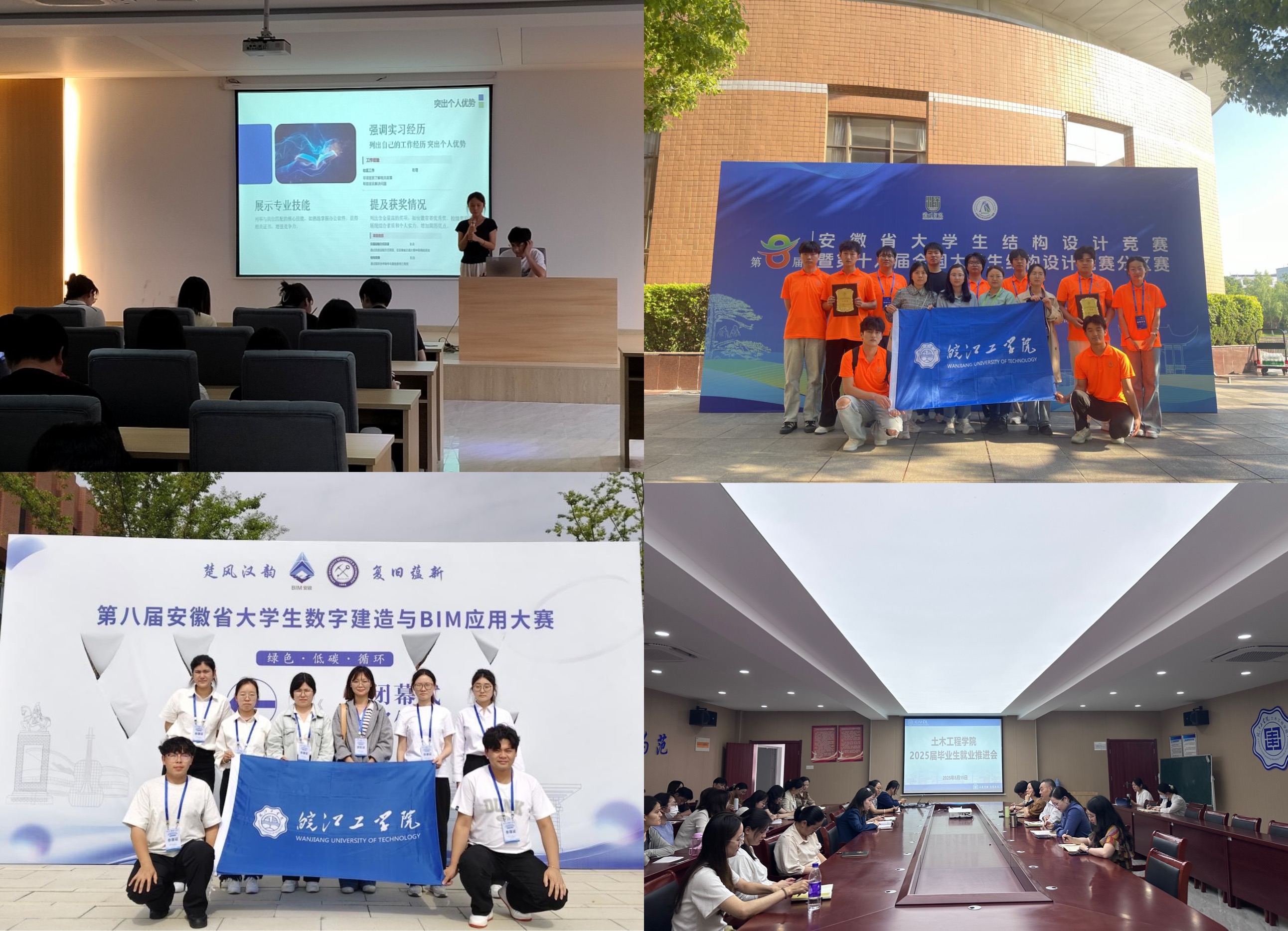 构建“1+N”党员服务体系,教师党员精准帮扶就业困难学生,从简历优化、实习推荐到教师联动,形成全链条支持体系。同时,教师党员主动承担指导学生竞赛任务,在2025年安徽省大学生结构设计竞赛、安徽省大学生数字建造与BIM应用大赛等各类学科竞赛中,通过经验传承和技能指导助力团队斩获佳绩。学院师生团队在第十一届国际高校BIM大赛中获国家级三等奖,实现了学校在该赛事零的突破,为评估工作增光添彩。