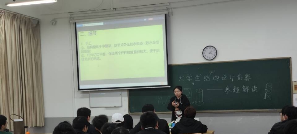 随后,往届参赛队员汤亚兰同学通过图文并茂的方式为同学们做经验交流分享,从构件截面的选取、节点的处理到整体结构的轻盈和稳定,从赛初的彷徨到赛后的喜悦,生动讲解了参与竞赛的经验和个人心得,提出了许多有关比赛和组队的建议,使现场同学深受启发和鼓舞。