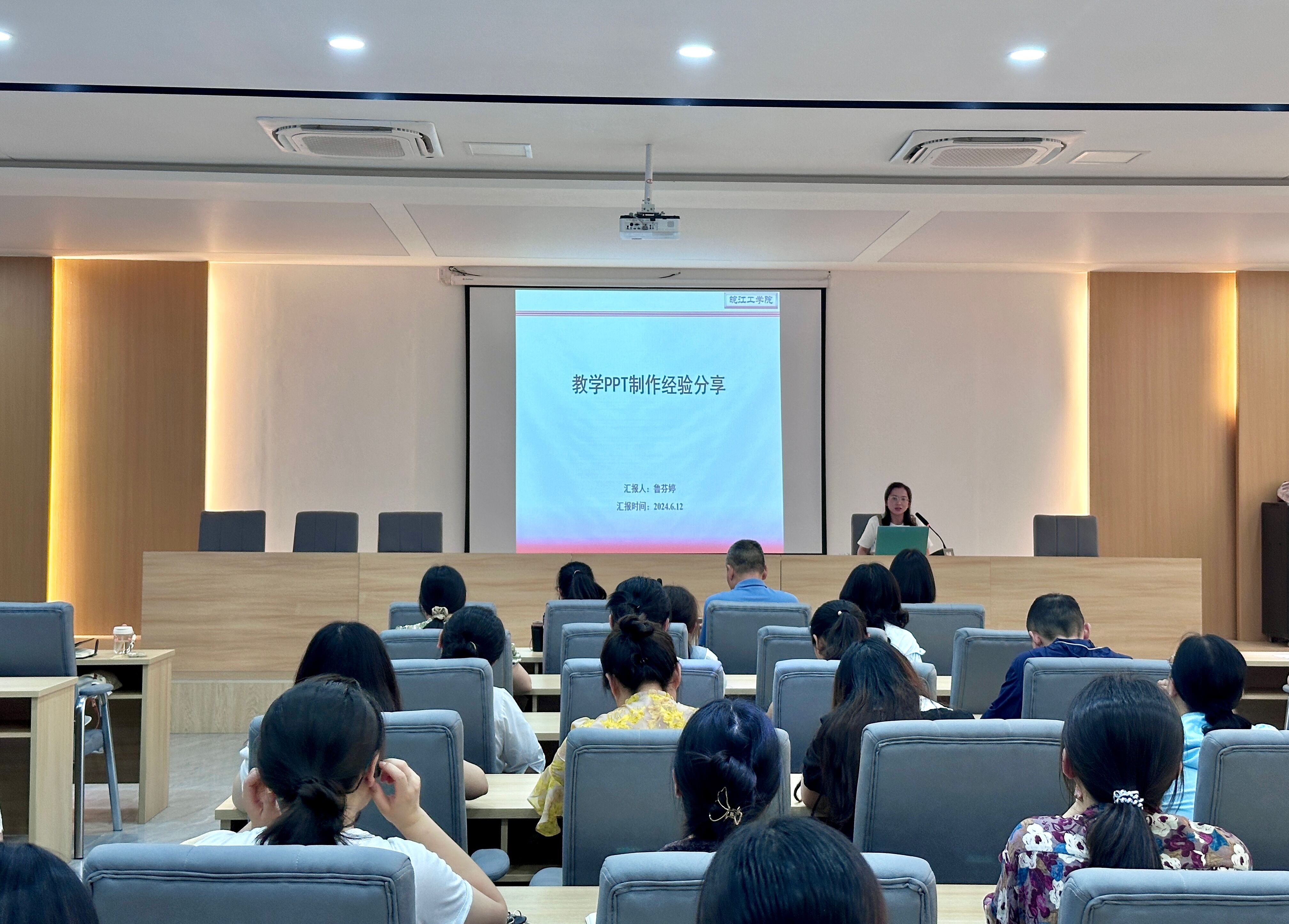 为提高教师备课与课堂教学质量,会议还特别邀请了土木工程专业优秀教师、2023年安徽省教坛新秀、2023年校级教学技能大赛课件设计赛道一等奖获得者鲁芬婷老师为大家进行了教学课件制作经验分享。鲁芬婷老师结合实际案例,深入浅出地讲解了PPT课件制作中的常见误区、常用制作技巧和内容设计原则,分享了自己在教学中积累的经验和技巧,并演绎了如何将制作好的PPT有效地呈现出来,使全体教师深受启发。