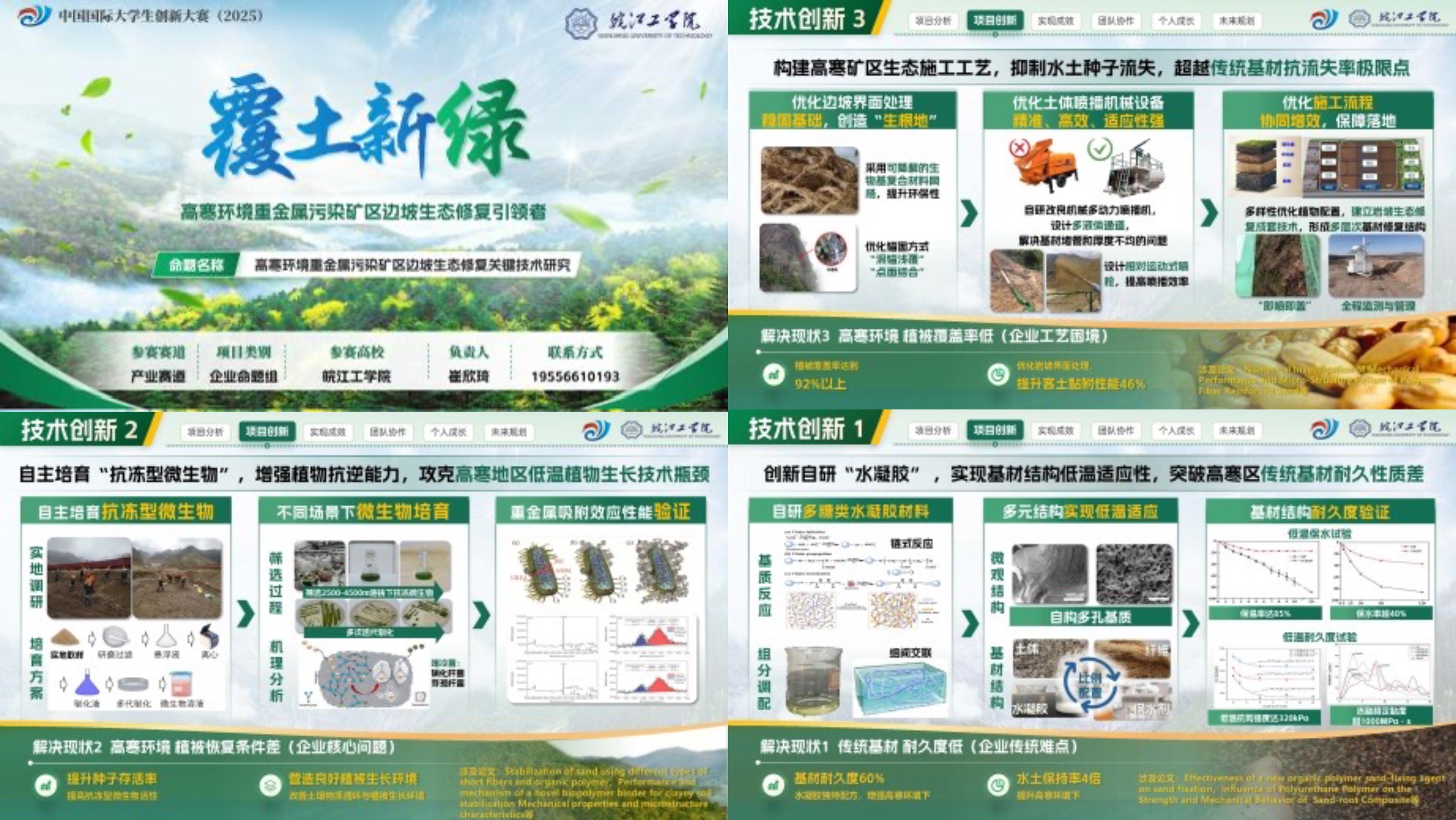 大赛自5月启动以来,土木工程学院和创新学院对大赛进行整体部署,为提高参赛水平,开展种子项目培育和大赛专题系列讲座,邀请河海大学、合肥工业大学相关专家开展主题讲座交流。备赛阶段,邀请省赛专家针对项目计划书、项目PPT、项目路演答辩等开展多轮次线上线下辅导,项目负责人崔欣琦同学、队员彭雨欣同学,在力学教研室教师马鸣带领下,在河海大学进行了为期一周的封闭训练,不断打磨提升参赛项目质量,为提高成绩提供保障。经过校赛、省赛网评,《覆土新绿-高寒环境重金属污染矿区边坡生态修复关键技术研究》项目入围总决赛,并取得87.56的高分,位居分组赛(18队)第四名,在省赛中斩获金奖。