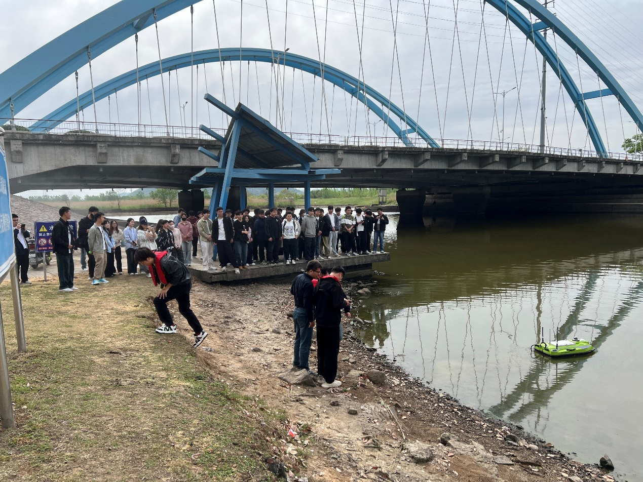 现场实习活动分为两个部分进行。在烟墩山文化遗址公园,郭鹏工程师利用全站仪详细讲解并演示了控制网建立及地形点测绘的过程,同时介绍了GPS测量原理及其作业流程。学生们积极参与实践,亲身体验了使用全站仪和GPS接收机进行地形数据采集的方法,加深了对这些技术应用的理解。在节庆广场,重点是对流经此处的采石河进行水下地形测绘。盛仲进工程师向学生们展示了使用先进无人船进行水下地形测绘的方式,并进行了现场演示。牛立伟工程师则通过精灵无人机的操作示范,分享了无人机遥感信息获取、图像处理、分类判读及制图的技术要点。这一环节让学生们了解到了水下地形测绘的独特挑战和技术解决方案。