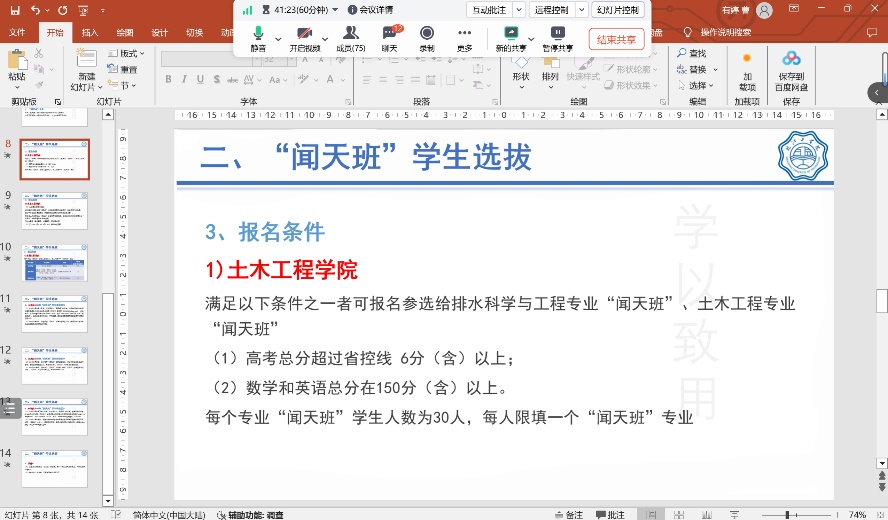 随后,介绍了学校正在推行的“闻天班”学生选拔工作。“闻天班”作为学校精英教育的典范,旨在选拔并培养一批具有卓越潜力和创新精神的专业人才。曹老师详细介绍了“闻天班”的选拔范围、“闻天班”专业、报名条件及选拔标准,对有意愿且符合报名条件的学生进行答疑解惑并鼓励报名。