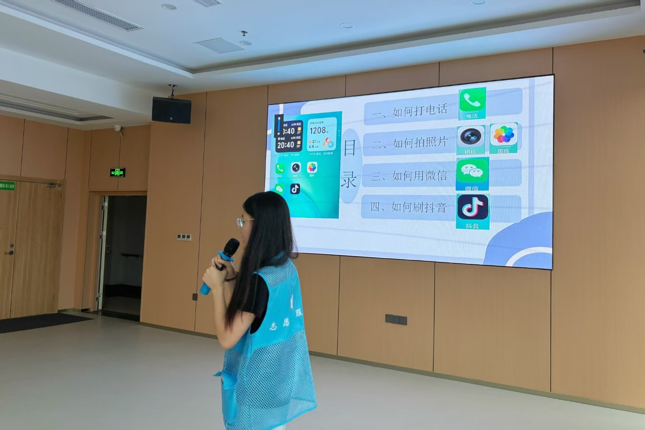 在活动过程中,志愿者们不仅关注老人们的物质生活,更注重他们的精神需求。他们深知,在当今社会许多老人虽然生活无忧,却因缺少家人的陪伴而感到孤独。因此,志愿者们为了让老人们和家人们沟通方便,开展了一场“教老人们使用智能手机”为主题的讲解活动。志愿者们耐心热情的为老人们讲解如何使用智能手机,精彩的讲解让空气中弥漫着青春的活力与朝气,老年公寓充满了欢声笑语。