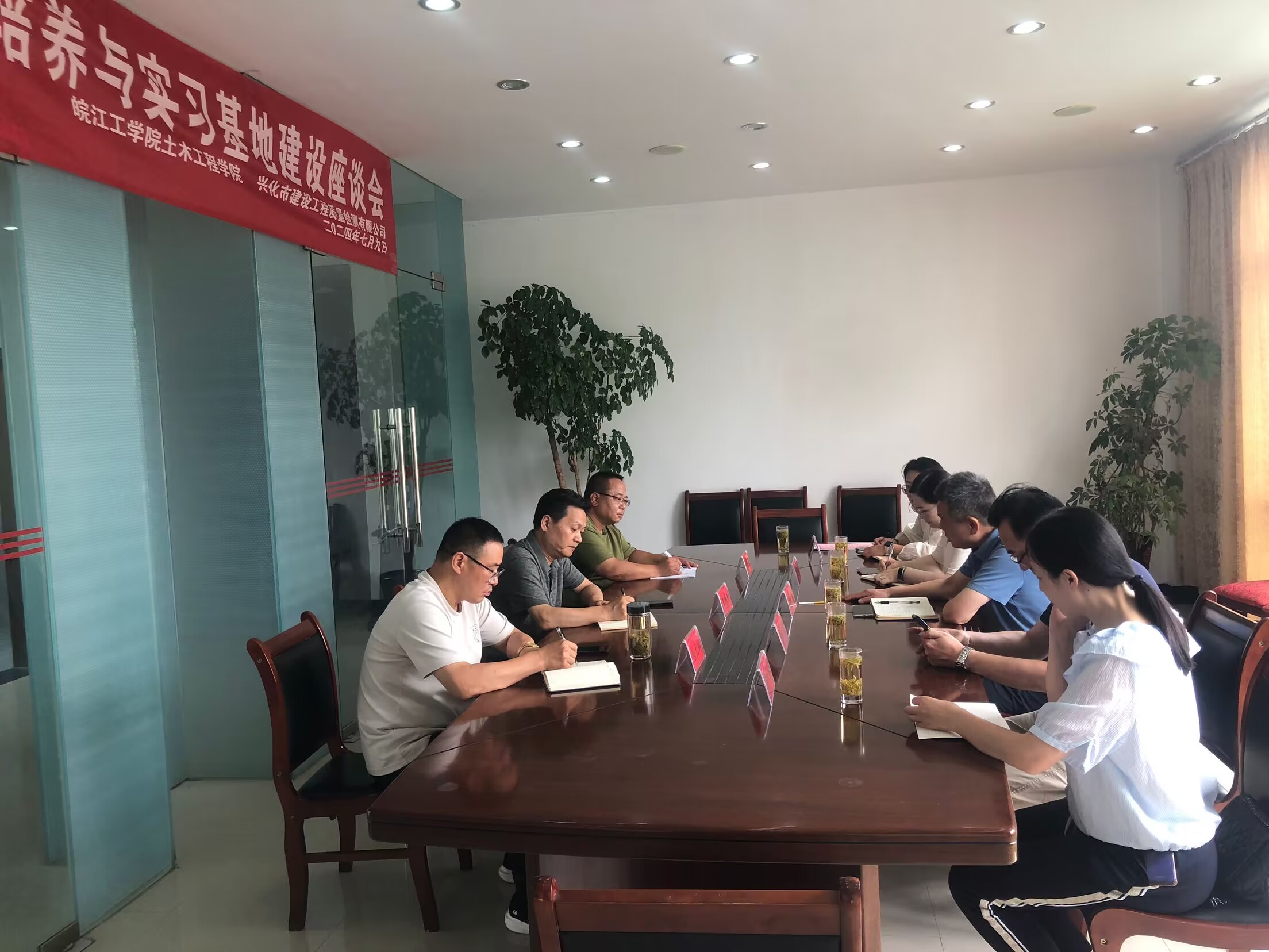 为进一步深化产教融合、校企合作,提升学院人才培养质量,7月9日上午,土木工程学院与兴化市建设工程质量检测有限公司举行人才培养与实习基地建设座谈会。土木工程学院院长唐德高、副院长李杰如、工程结构教研室主任徐中秋、土力学与地基基础教研室主任刘加冬、土木工程专业兼职教授张永乐及教师赵宏渠,兴化市建设工程质量检测有限公司董事长、总经理王辉平,副总经理、总工陈立辉,桩基检测科科长房元忠等参加。