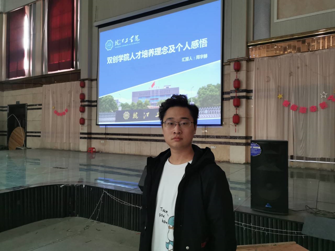 接着,我校双创学院的周宇赫老师介绍了自己的学习经历,作为土生土长的铜陵人,周老师的经历让在场的同学们看到了自己的影子。周老师和我校双创学院获得的成果和奖项让在场的同学们心生向往、赞叹不已。