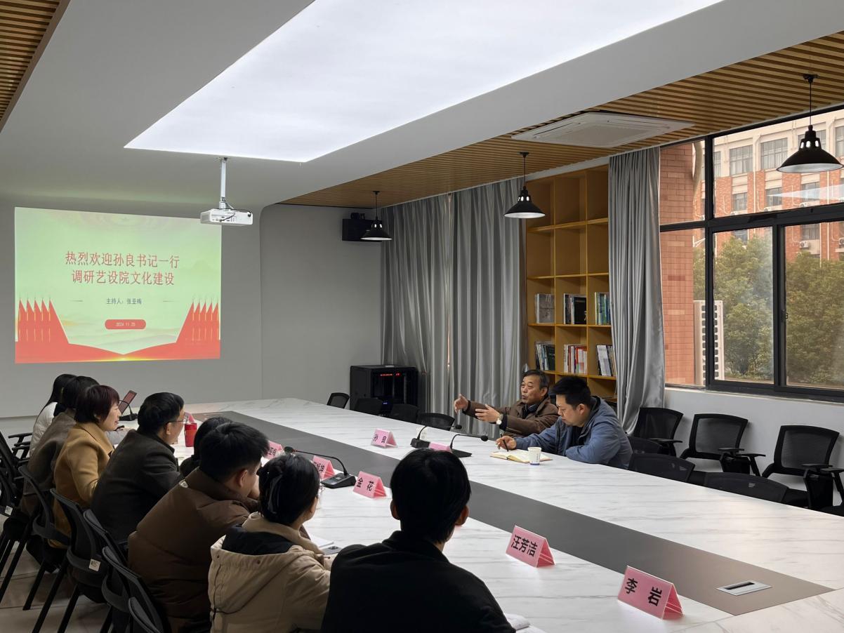 11月25日下午,校党委副书记孙良、党务部部长助理王飞一行赴艺术设计学院开展学院文化建设专项调研。学院党总支书记张亚梅主持会议,院长伍旭坤、副院长金花、副书记程楠楠以及负责文化建设工作的青年教师参加会议。