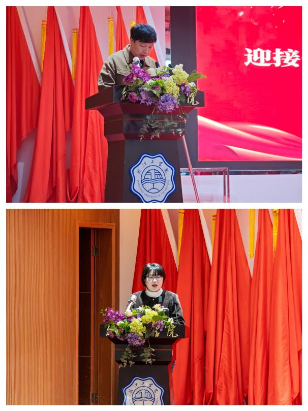教工党支部书记曹哲与学生党支部书记吴语嫣分别代表师生党员宣读了《“迎评促建 党员双带”承诺书》,承诺以“带头学习标准、带头践行规范”为准则,引领全院师生在课堂教学、学术创新、学风建设、文明实践中发挥先锋模范作用。