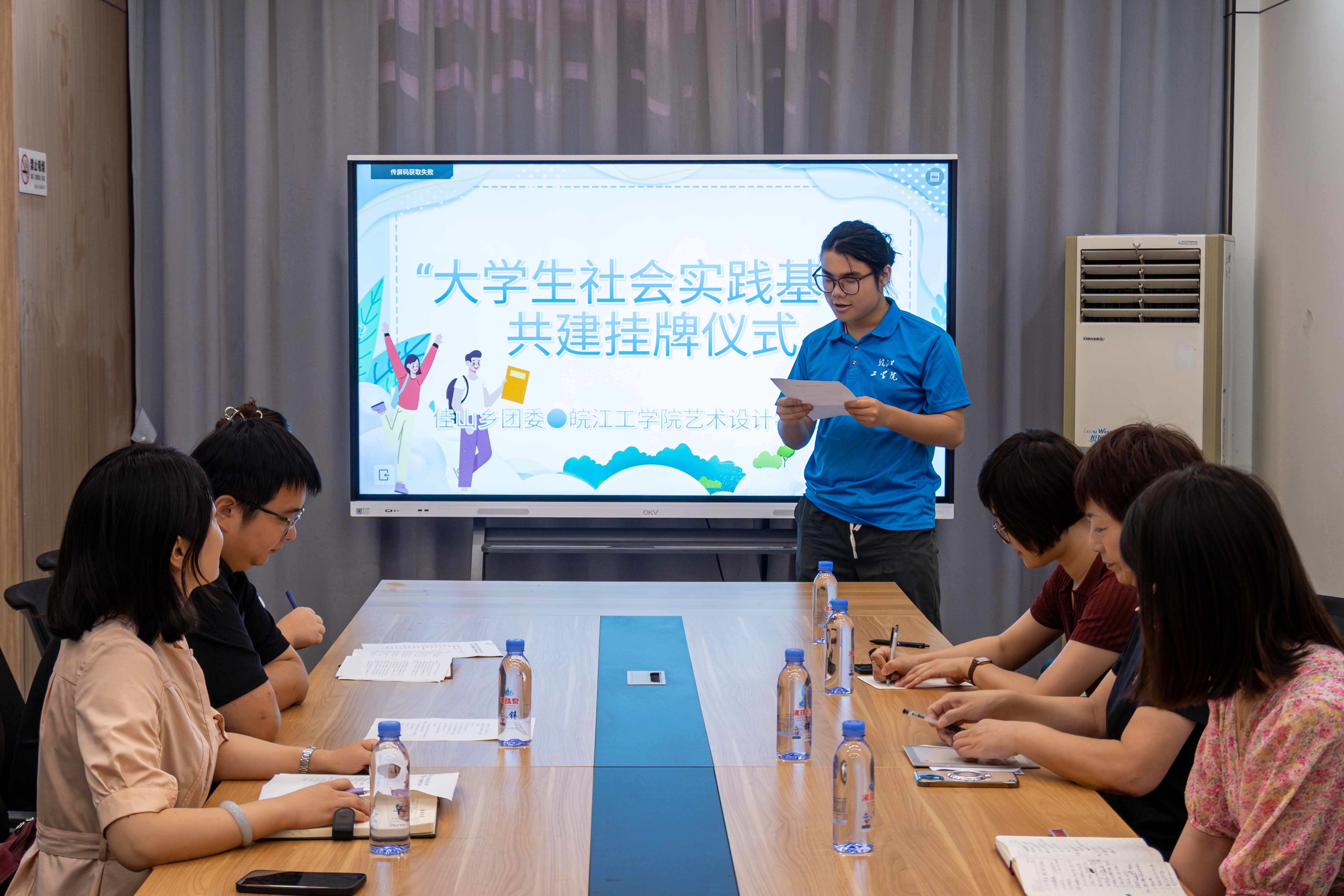为深化大学生专业实践与社区美育需求融合,拓宽学生就业渠道,2025年9月5日上午,艺术设计学院与佳山乡团委于佳山乡为民服务分中心共同举行“大学生社会实践基地”共建挂牌仪式。雨山团区委书记王堃、佳山乡党委委员刘琴、佳山乡团委副书记张梦琦、艺术设计学院党总支书记张亚梅、副书记程楠楠、分团委书记刘慧及学生代表共同出席。