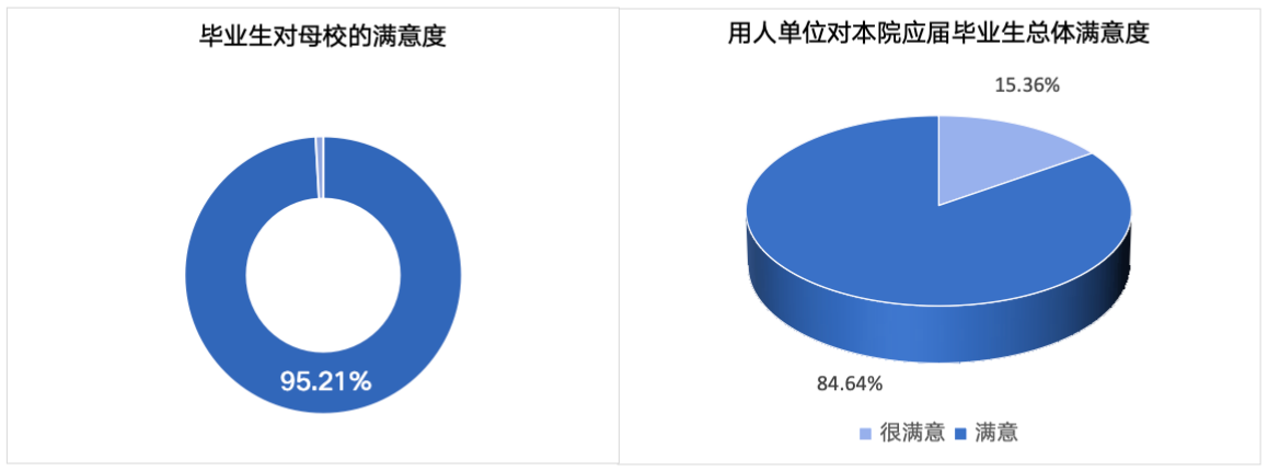 我院毕业生对母校的整体满意度评价较高,我院 2023 届毕业生对母校的总体满意度为 95.21%。用人单位对我院毕业生的总体满意度为100%,其中很满意的比例为 15.36%。九成以上的毕业生认可母校的教学工作,教师整体指导效果较好。我院 2023 届毕业生对教师学习指导、职业规划和就业指导的满足度评价分别为 91.68%、89.19%、90.06%。教室教学设备、实验设备、艺术场馆及图书馆满足学生学习需求。我院 2023 届毕业生对“教室及教学设备”“实验、实训及相关设备”“艺术场馆及展馆”和“图书馆与图书资料”的满意度评价较高。