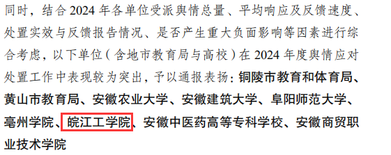 近日,中共安徽省委教育工委、安徽省教育厅对2024年度全省教育舆情工作情况进行通报。我校舆情应对处置工作表现突出,获通报表扬。全省7所高校获此殊荣。