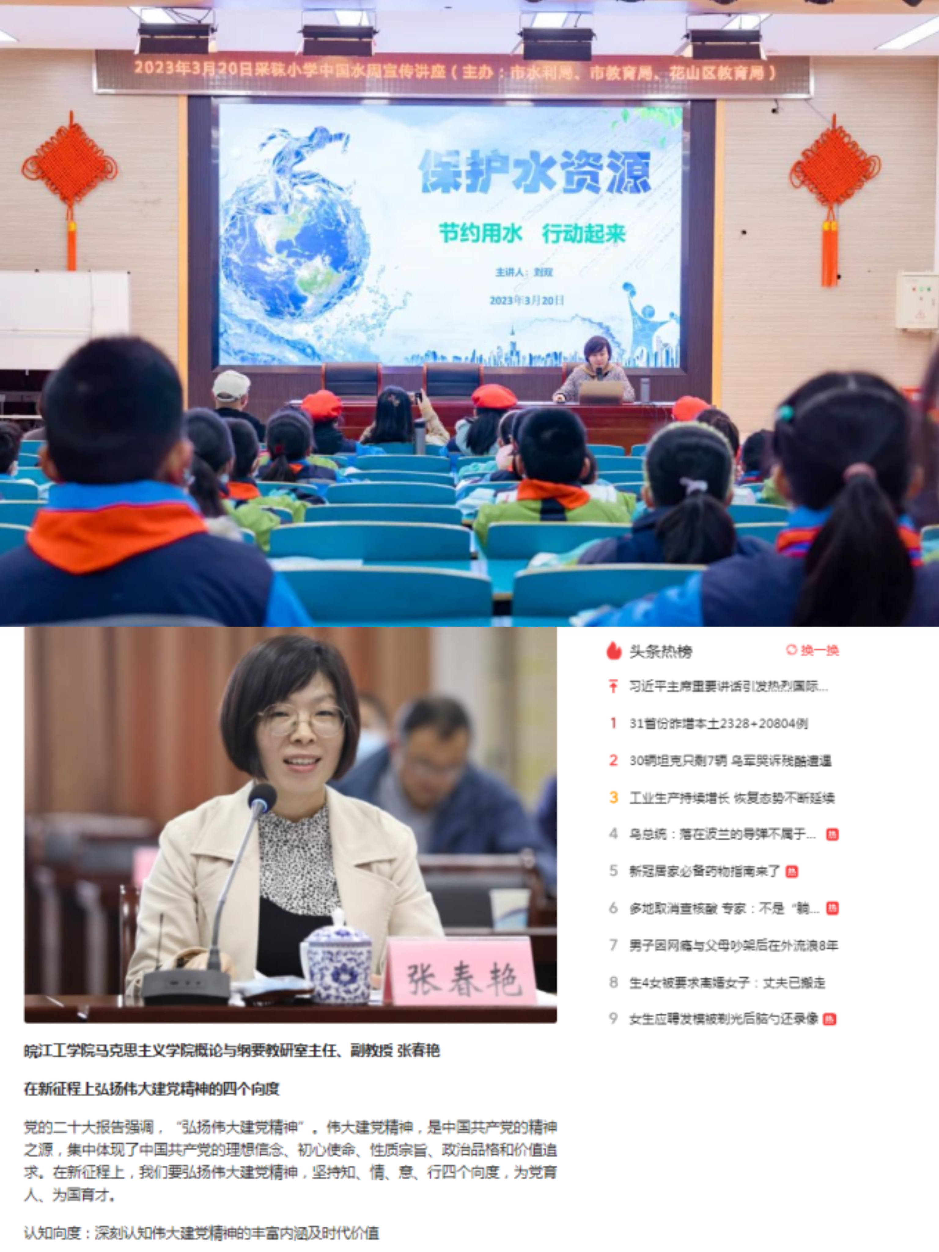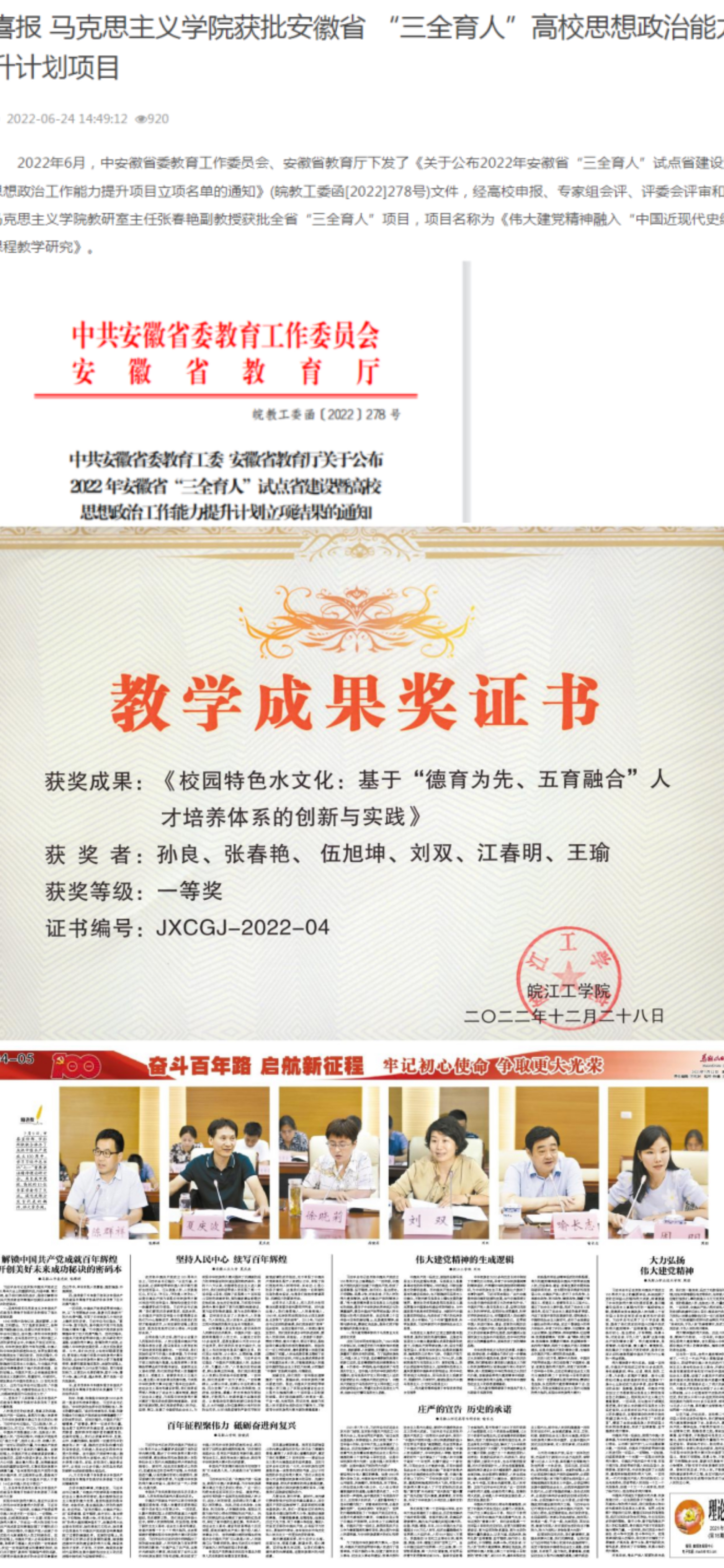 学院锚定“大思政课”建设方向,凝聚各方资源,加强对外开放型、内涵丰富型的高质量马院建设目标,建院以来,学院联合中共马鞍山市委党校、中共和县市委党校签订战略协议,充分发挥不同领域资源效用促进学院的学科建设、学术研究、人才培养工作,进一步提升教学研究水平,提升思政课教学质量,提升思政课的实效。发挥水利专业特色优势,我院秉承“河孕育文明、海凝聚智慧”的人文气魄,致力于“专特通结合、中西马融汇”的学术理想,将进一步深入开展思想政治理论课教学与研究、以及为地方政府和单位开展文化咨询等社会服务,以高水平的成果回报社会各界的关心和支持。